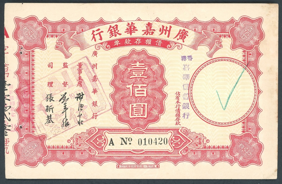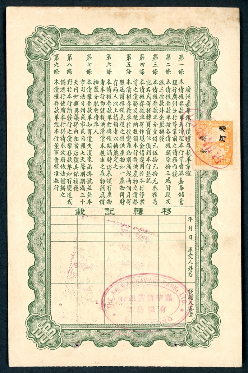 嘉華儲蓄銀行有限公司債券收據一百元,編號A10420,約UNC品相,中間有漬及褶痕