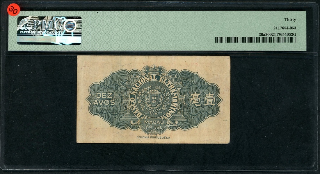 Banco Nacional Ultramarino, Macau, 10 avos, 1946, serial number E1955416, (Pick 36a), PMG 30 Very Fine