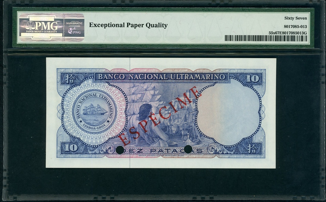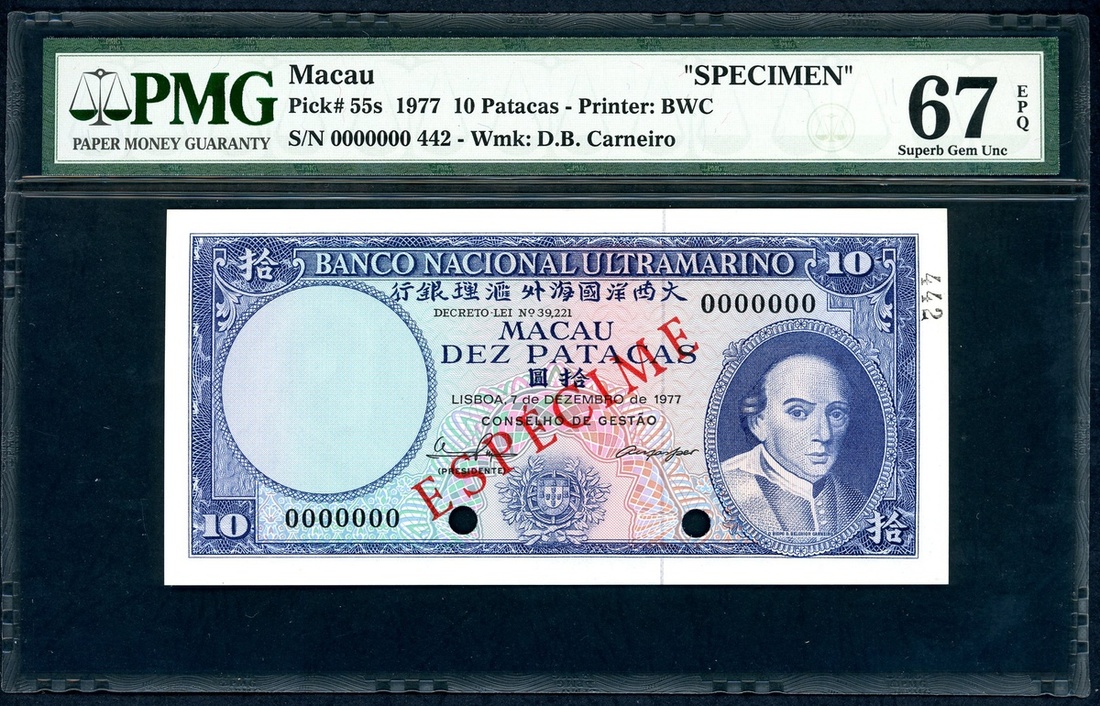 Banco Nacional Ultramarino, 10 patacas, 1977, specimen, serial number 000000, (Pick 55s), PMG 67EPQ, superb gem uncirculated.