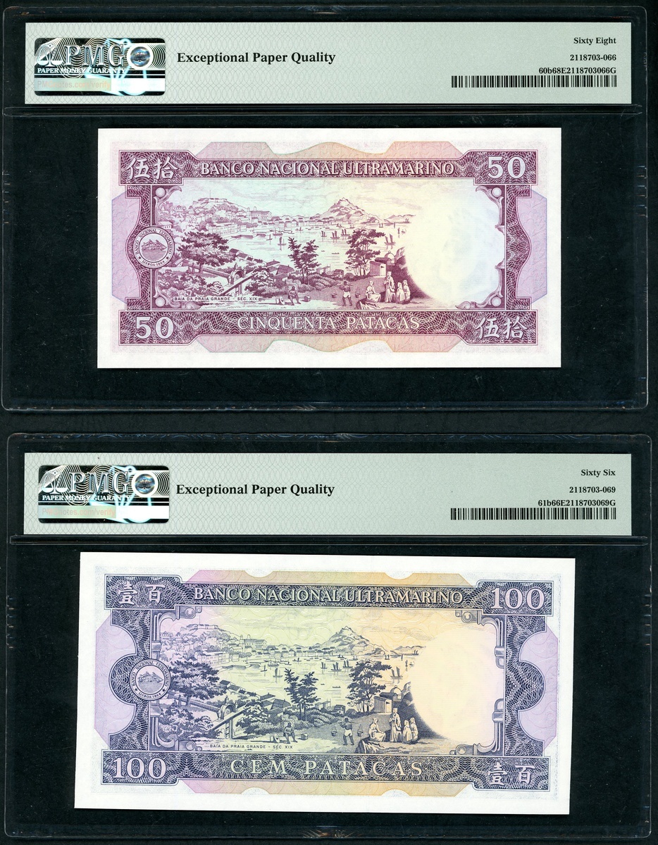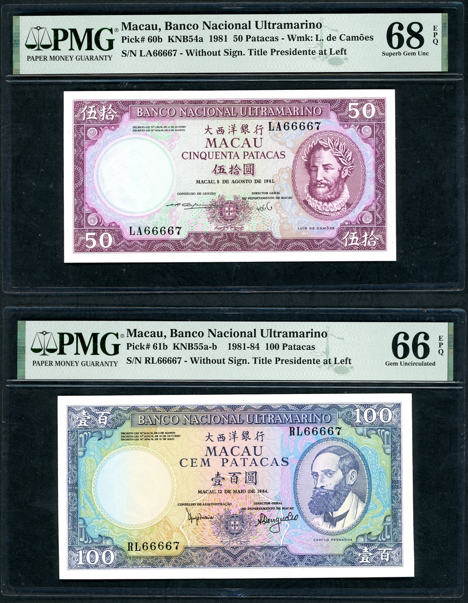 Macau, Banco Nacional Ultramarino, a pair of 50 patacas and 100 patacas, 1981 and 1984, with identical serial number LA66667 and RL66667, (Pick 60b, 61b), PMG 68EPQ and 66EPQ respectively.(2)