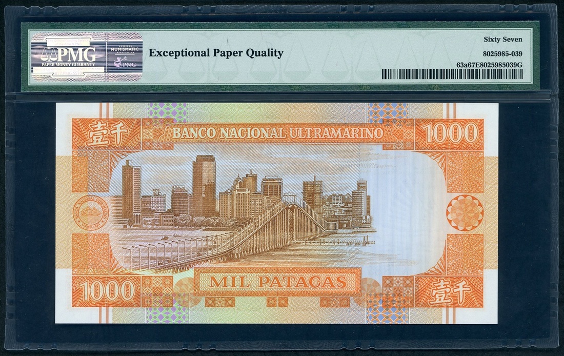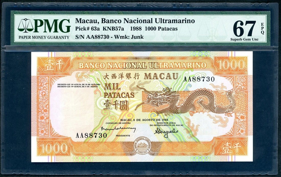 Banco Nacional Ultramarino, Macau, 1000 patacas, 8.8.1988, serial number AA88730, (Pick 63a), PMG 67EPQ Superb Gem Uncirculated.