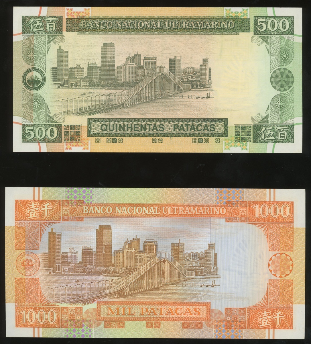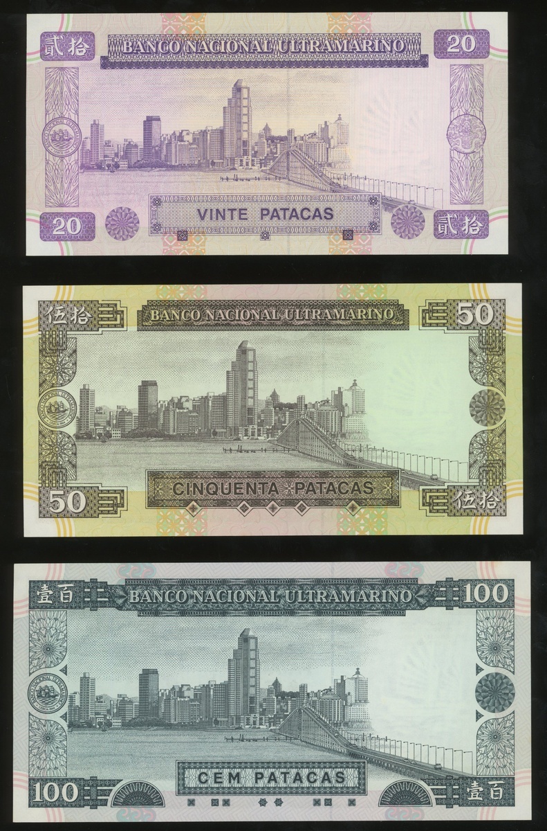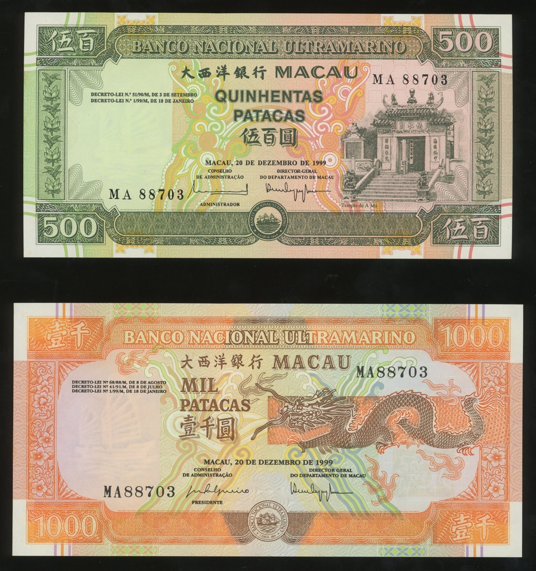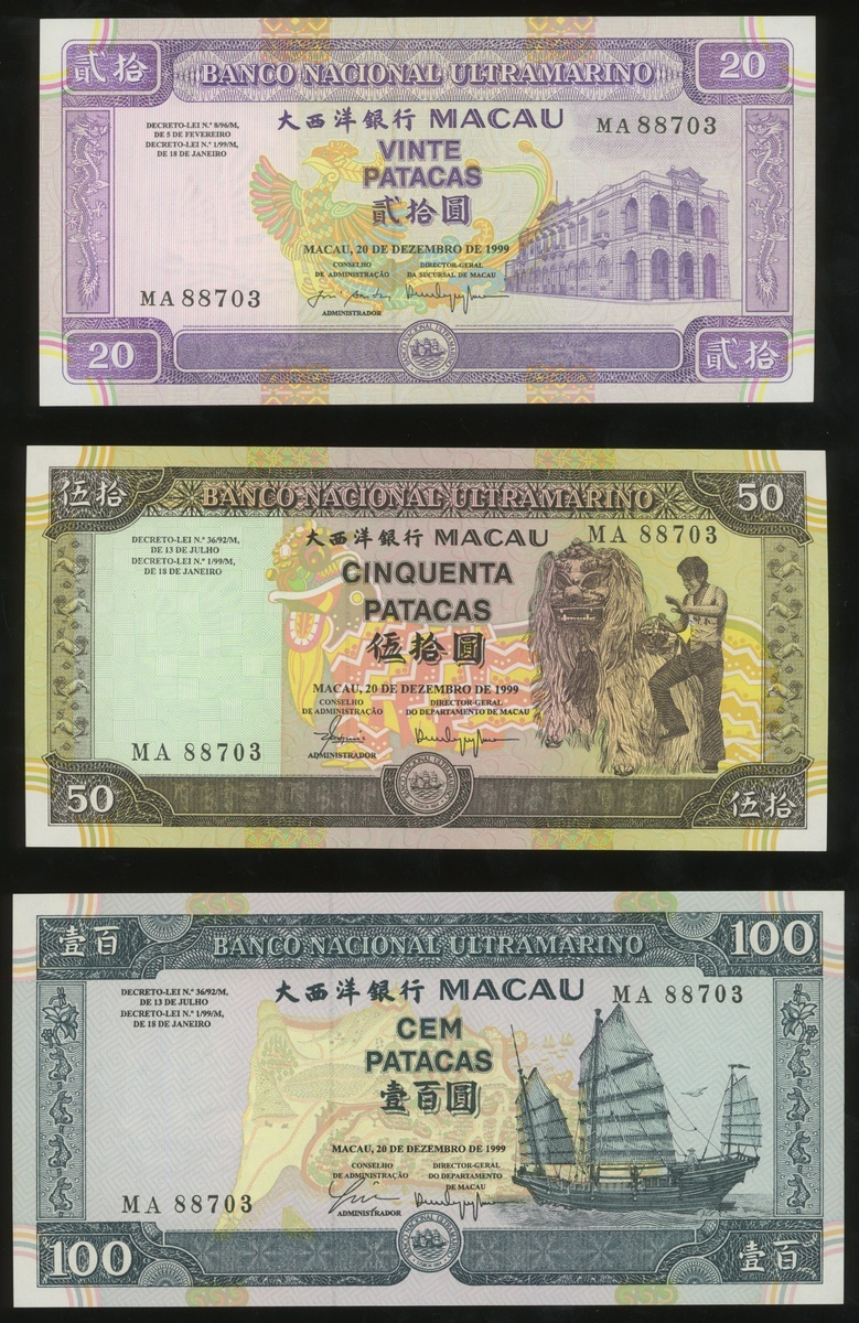 Banco Nacional Ultramarino, a set of 5 notes, 20, 50, 100, 500 and 1000 patacas, 1999, identical serial number MA88703, "Comemoracao da Passagem de Macau a REAM Notas emitidas pelo Banco Nacional Ultramarino em circulacaoo em Dezembro de 1999",