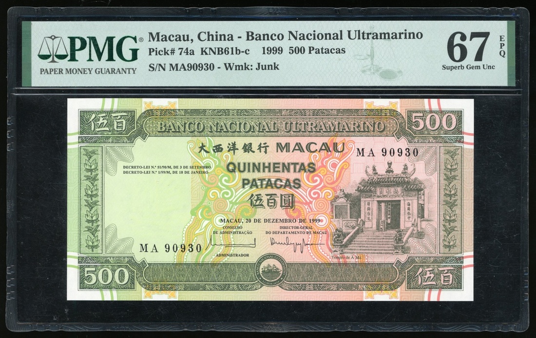 Banco Nacional Ultramarino, Macau, 500 patacas, 1999, serial number MA90930, (Pick 74a), PMG 67EPQ Superb Gem Unc