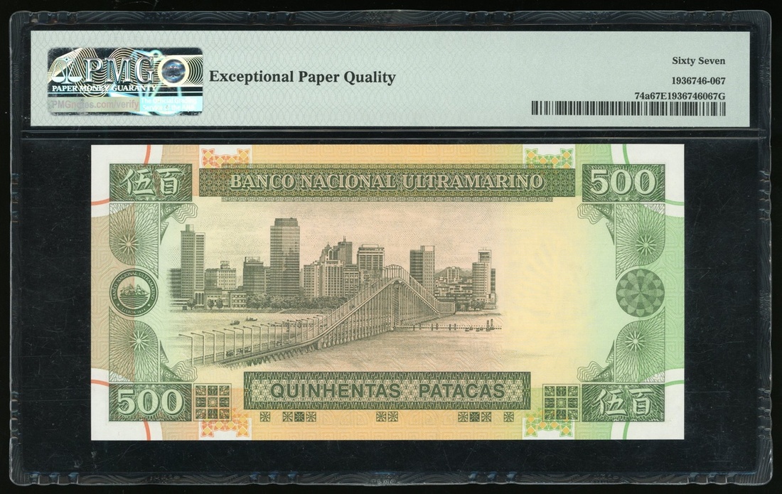 1999年澳門大西洋國海外匯理銀行500元,編號MA90930,PMG 67EPQ