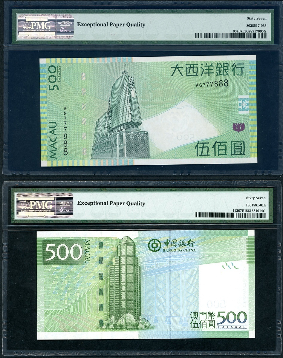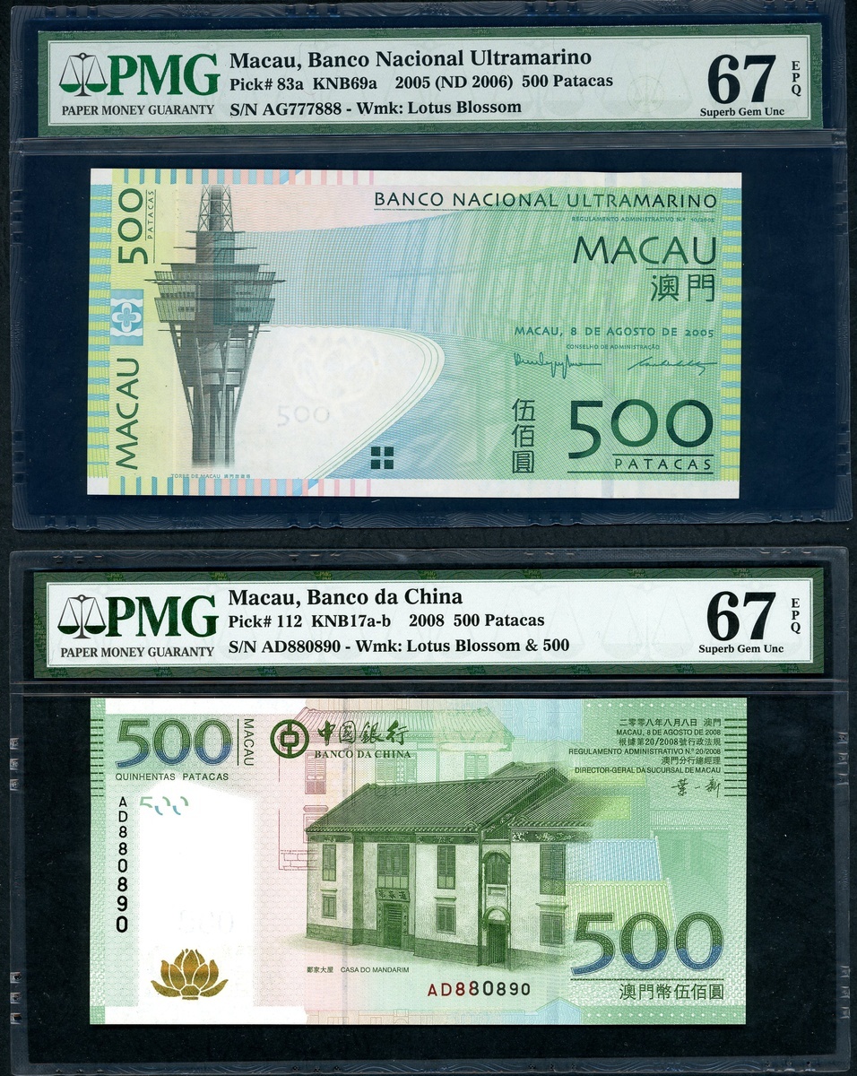 澳門500元一對,2005年大西洋國海外匯理銀行發行版別及2008年中國銀行發行版別,編號AG777888及AD80890,PMG皆評67EPQ
