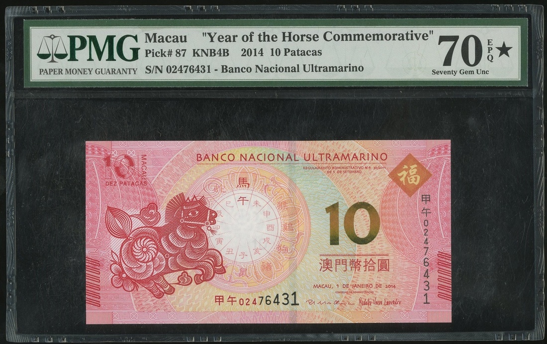 Banco Nacional Ultramarino, Macau, 10 patacas, 2014, "Year of the Horse Commemorative", serial number 02476431, (Pick 87), PMG 70*EPQ. One of three 70*s!