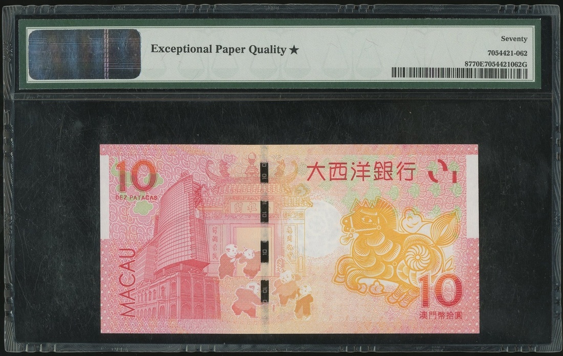 2014年澳門大西洋國海外匯理銀行10元馬年紀念鈔,編號02476431,PMG評70*,評級報告中僅有另外兩枚獲評同分