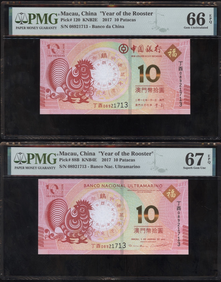 Macau: Banco Nacional Ultramarino and Banco de China, a pair of 'Year of the Rooster Commemorative' 10 patacas, 2016, identical serial number 08921713, (Pick 88B and 120), graded PMG 67EPQ and 66EPQ respectively (2).