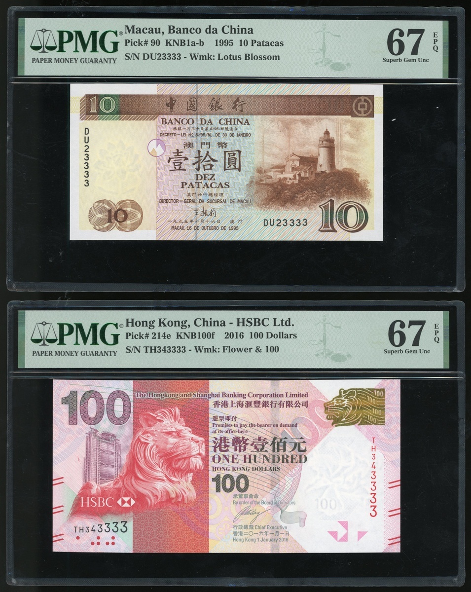 Bank of China, HK/Macau, a pair of near solid numbers, including 100 dollars 2016 serial number TH343333 and 10 patacas 1995, serial number DU23333,