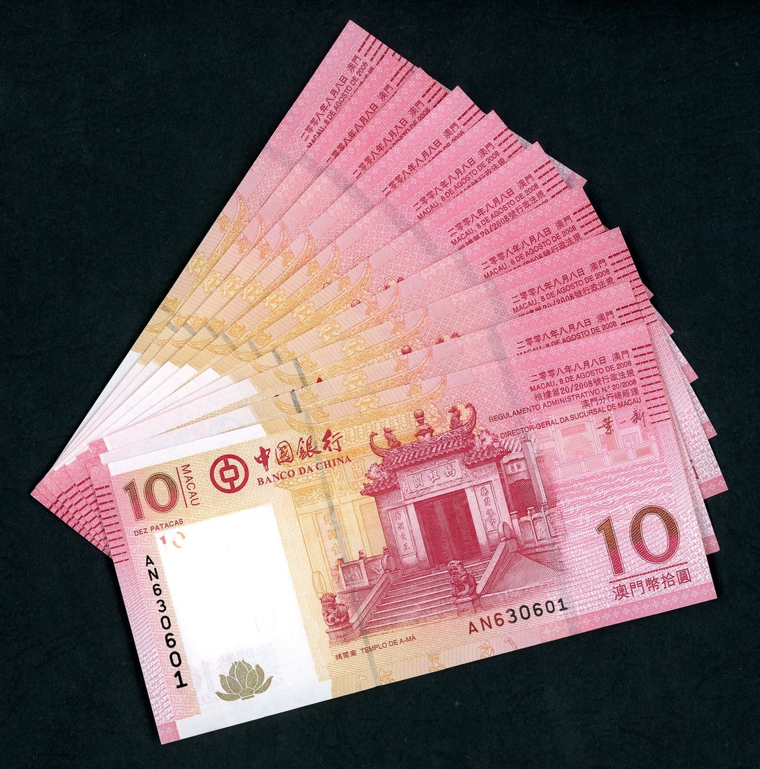 Banco da China, Macau, a group of matching number pairs 10 patacas (10), 2008, serial number AF/AN 630601, 630602, 630603, 630704, 630705,