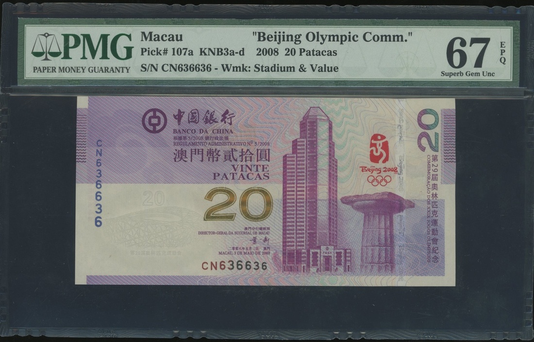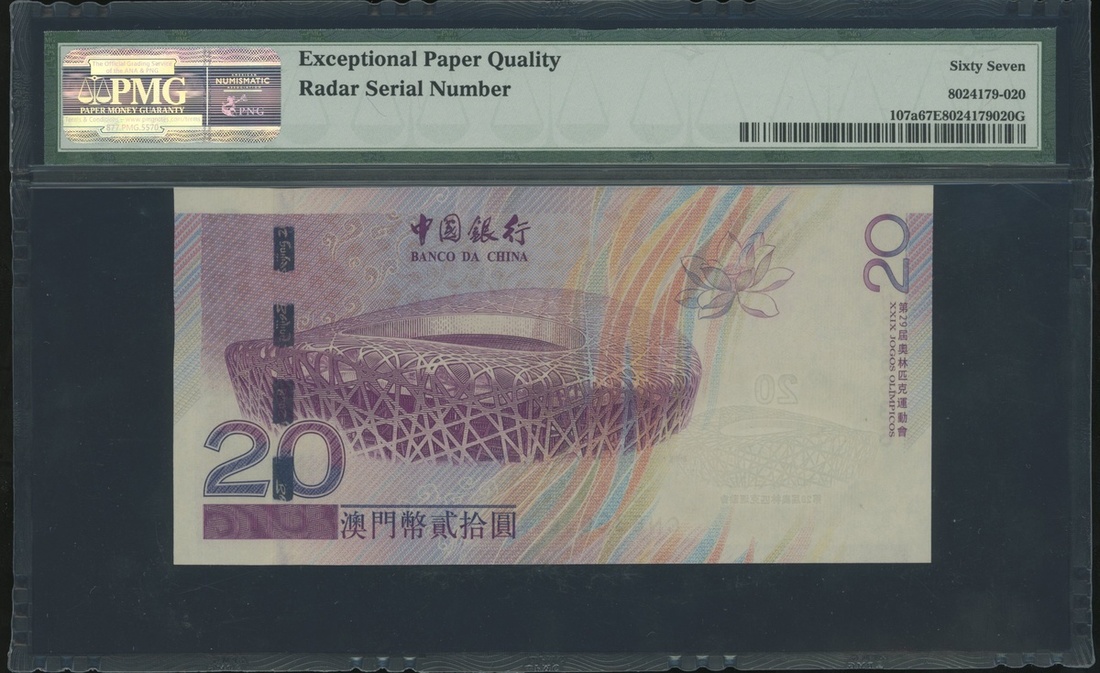 2008年澳門中國銀行20元北京奧運紀念鈔,雷達號CN636636,PMG 67EPQ