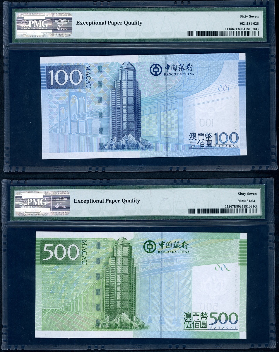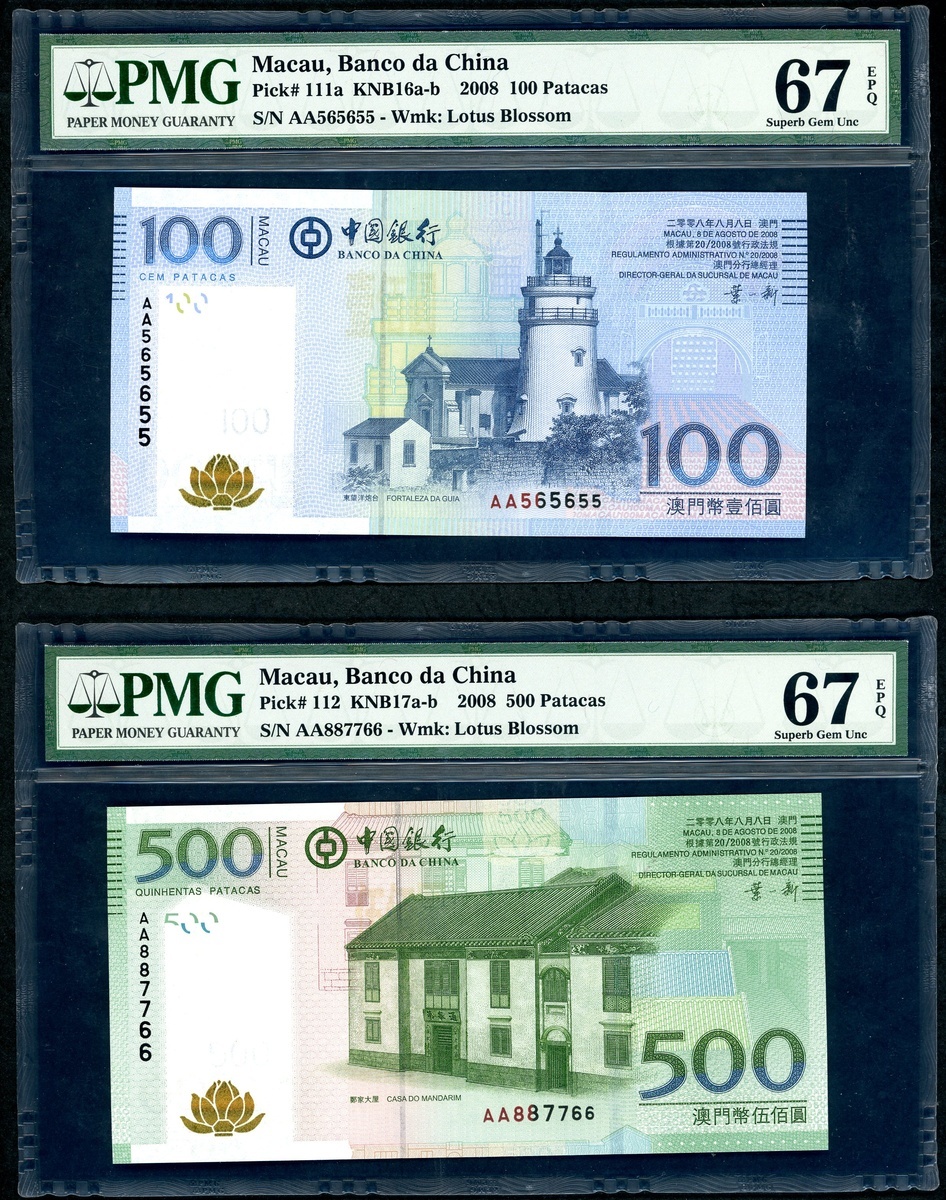Banco da China, Macau, a pair of 100 and 500 patacas, 2008, serial numbers AA565655, AA887766, (Pick 111a, 112), semi fancy serial number, PMG 67EPQ Superb Gem Unc (2)