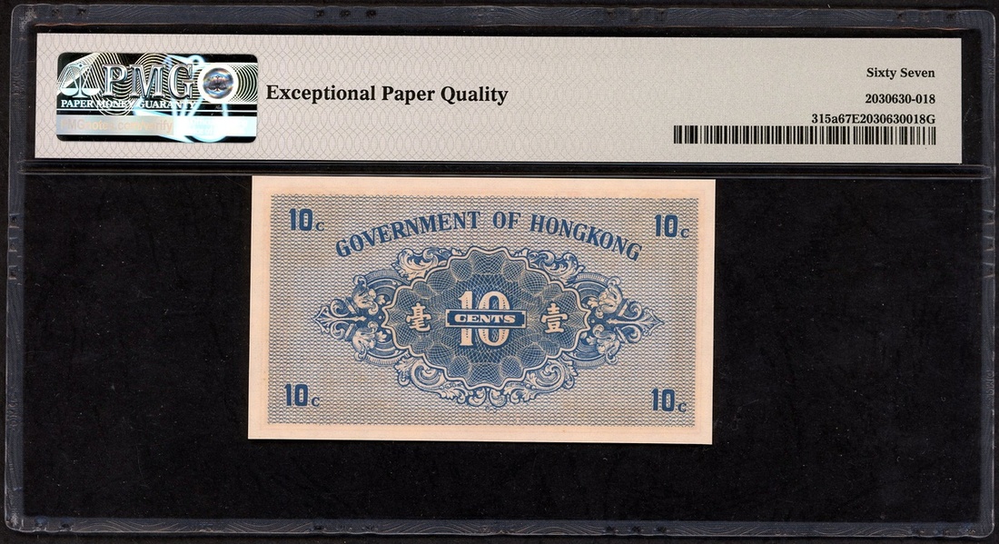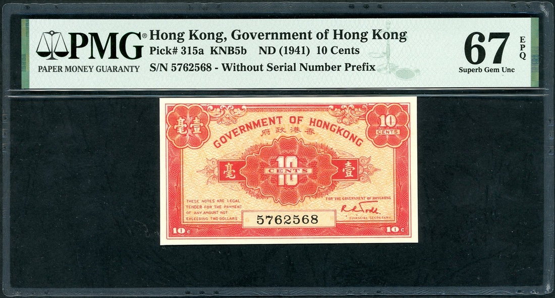 Hong Kong Government, 10 cents, ND(1941), serial number 5762568, (Pick 315a), PMG 67EPQ.