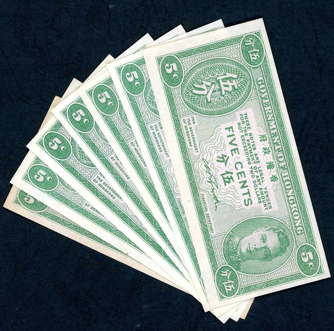 Hong Kong, a lot of 7x 5 cents, ND(1945), (Pick 322), 1 uncirculated, the rest very fine to about uncirculated.(7)
