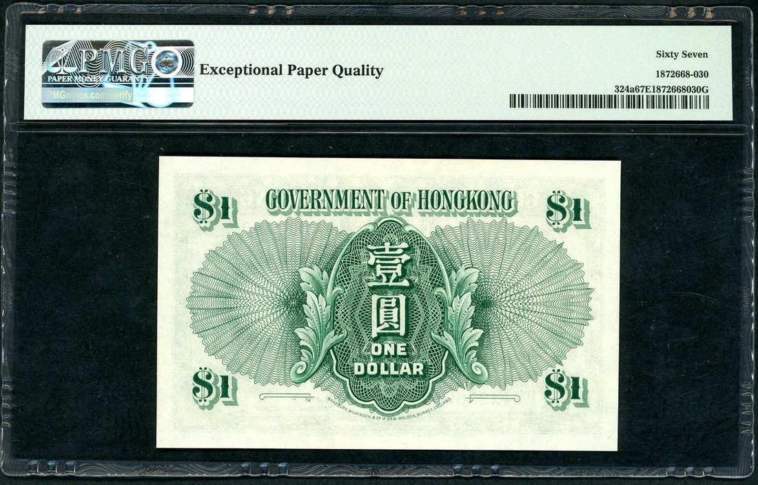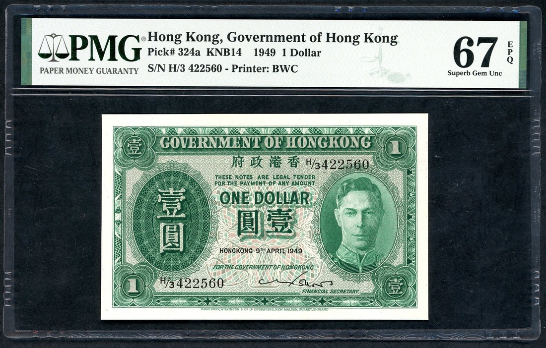 Hong Kong Government, $1, 1949, serial number H/3 422560, (Pick 324a), PMG 67EPQ.