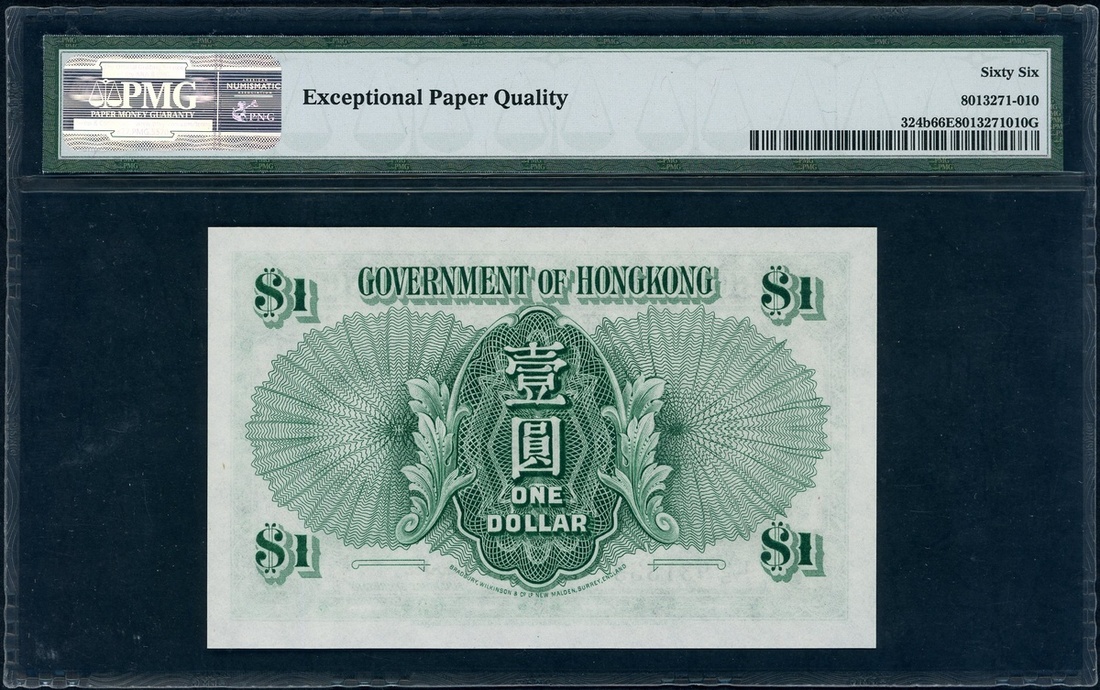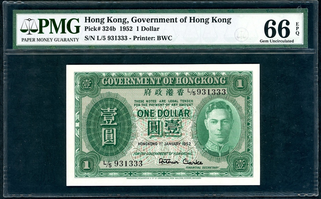 Government of Hongkong, $1, 1.1.1952, serial number L/5931333, (Pick 324b), PMG 66EPQ Gem Uncirculated