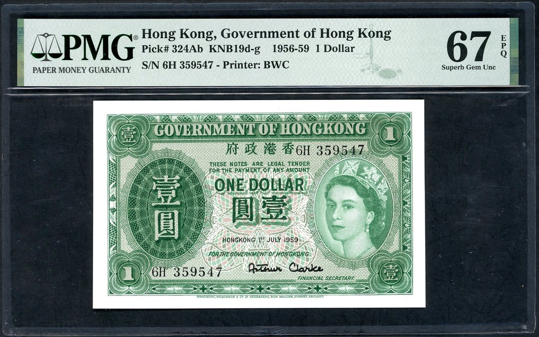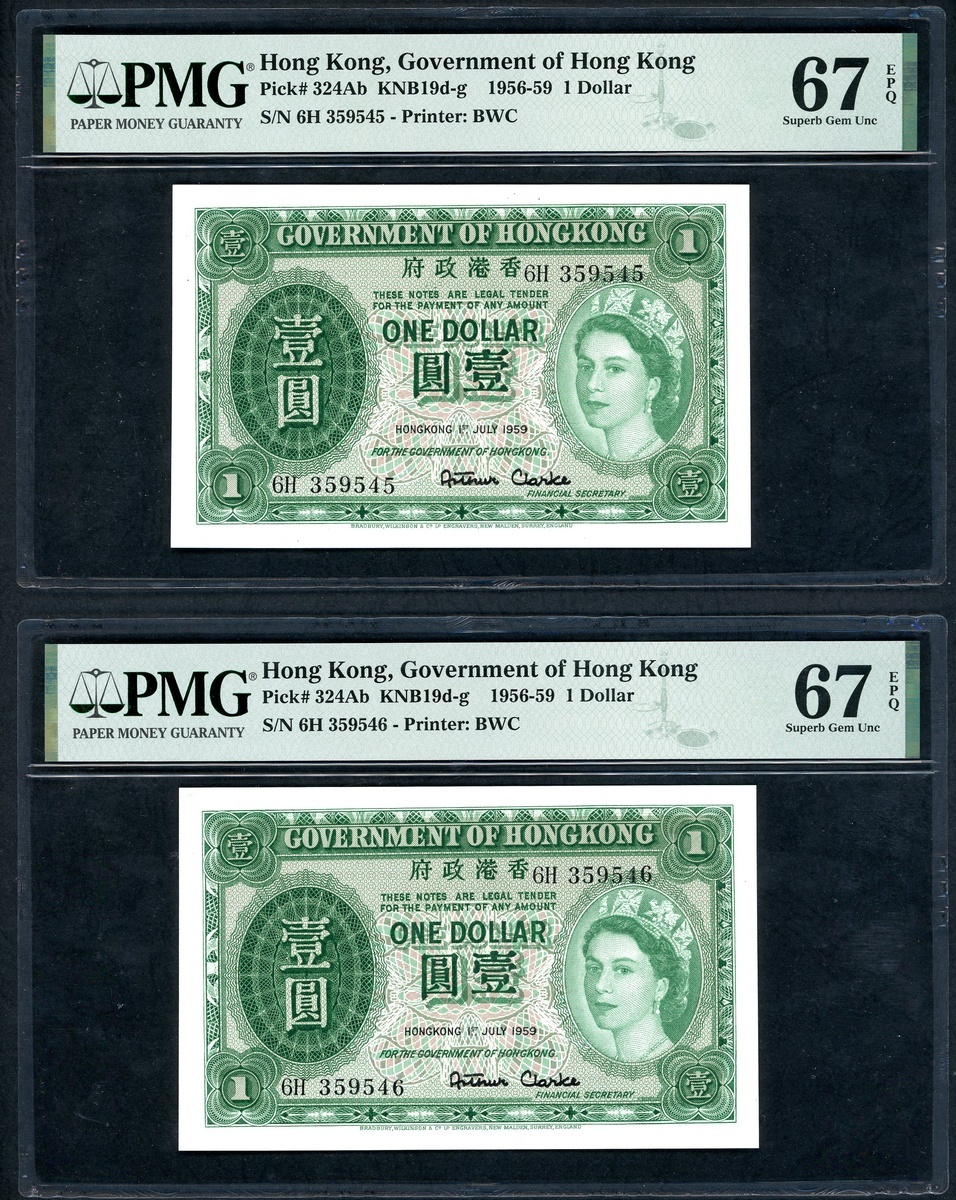 Government of Hong Kong, a consecutive group of 3x $1, 1.7.1959, serial numbers 6H 359545-47, (Pick 324Ab), all graded PMG 67EPQ Superb Gem Uncirculated (3).