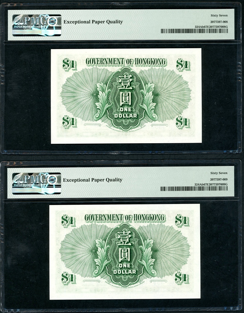 1959年香港政府1元連號3枚,編號6H 359545-47,PMG均評67EPQ
