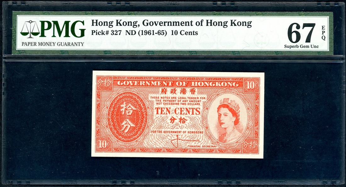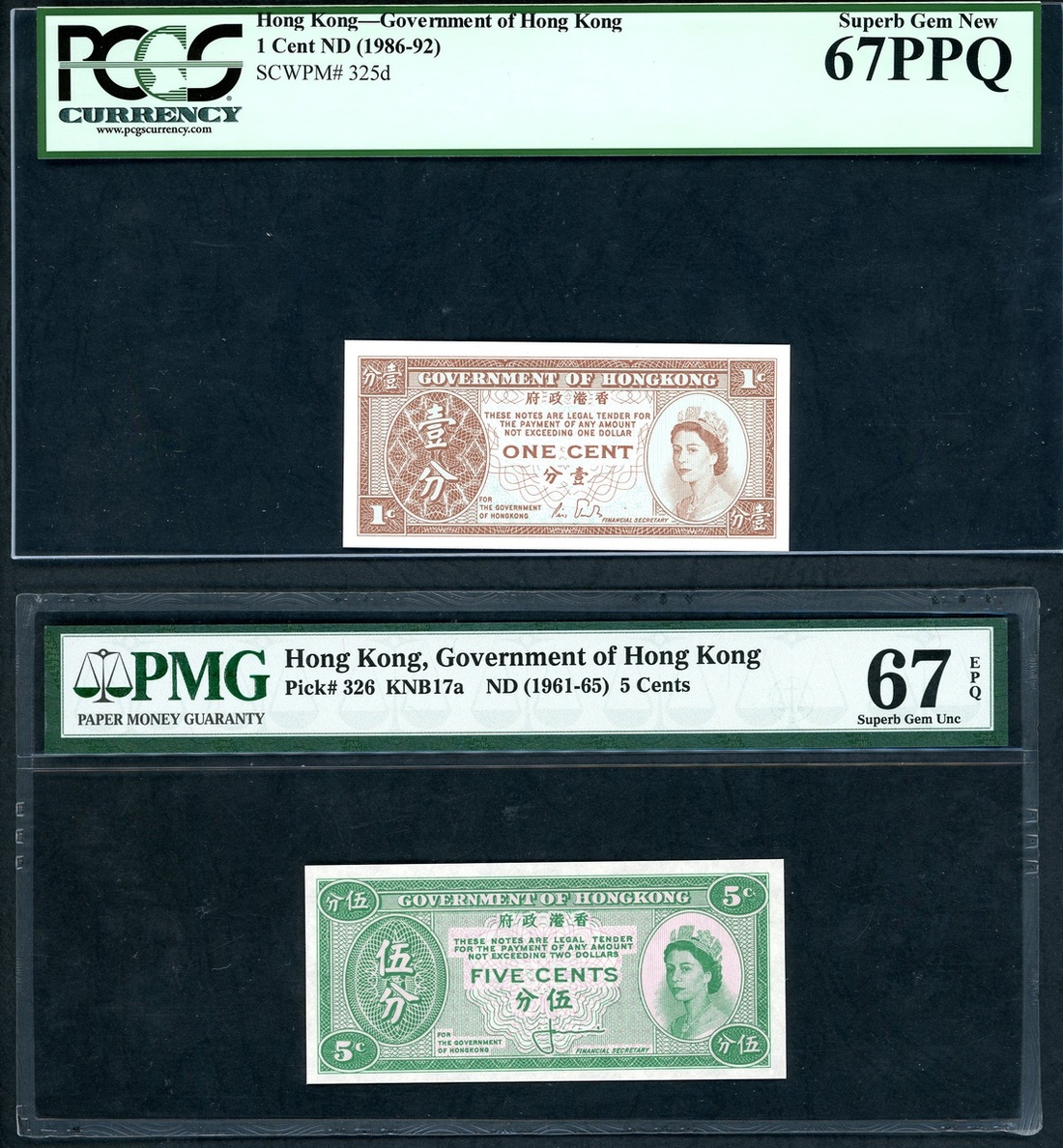 Government of Hong Kong, a group of 3 notes, consists of 1 cent, ND (1986-92), 5 cents, ND(1961-65), 10 cents, ND(1961-65), (Pick 325d, 326 and 327), graded PCGS Currency 67PPQ, PMG 67EPQ and 67EPQ respectively (3).