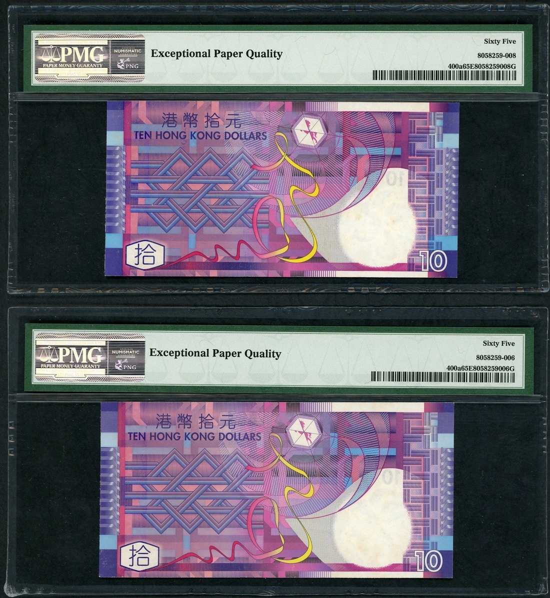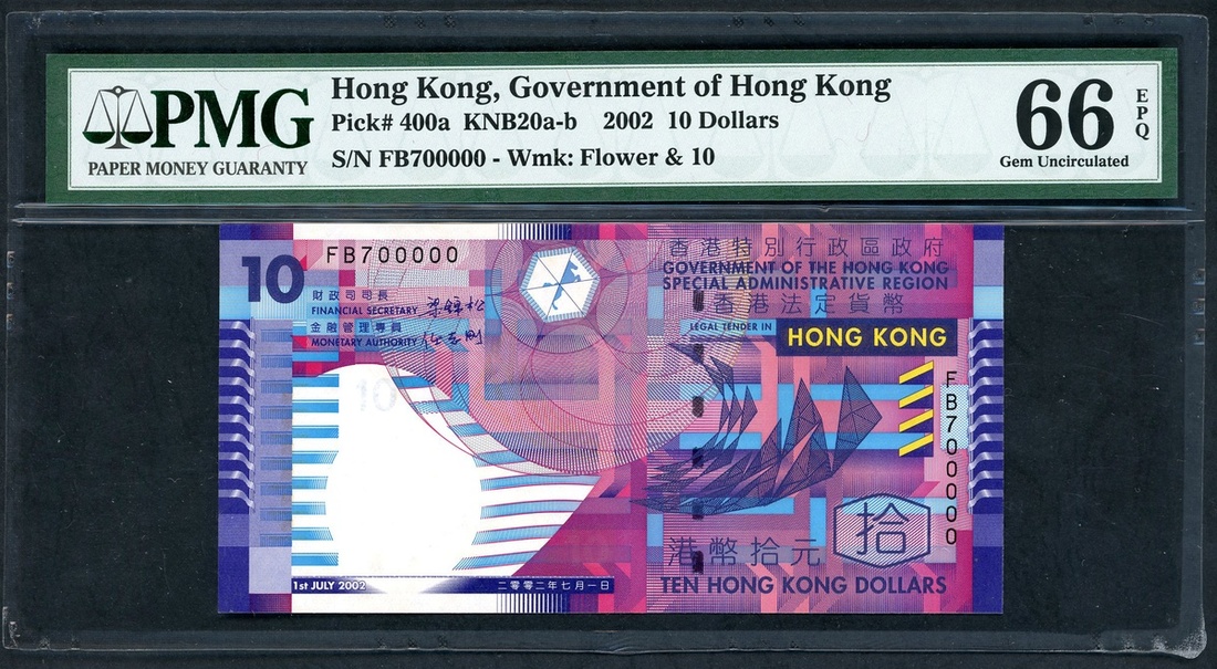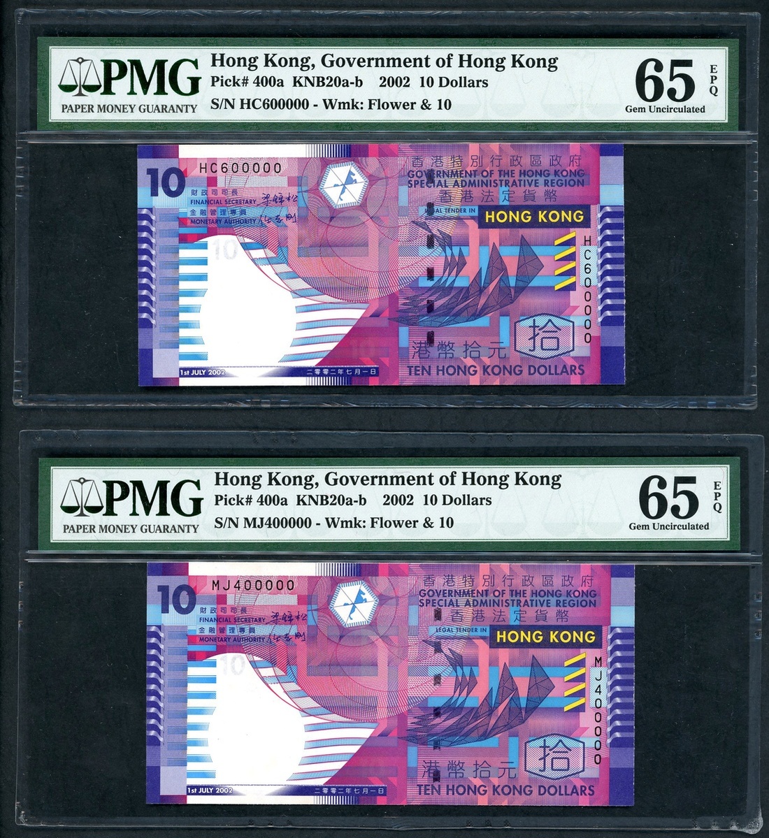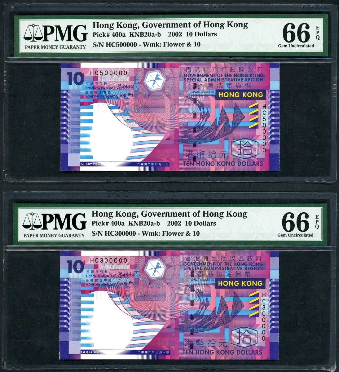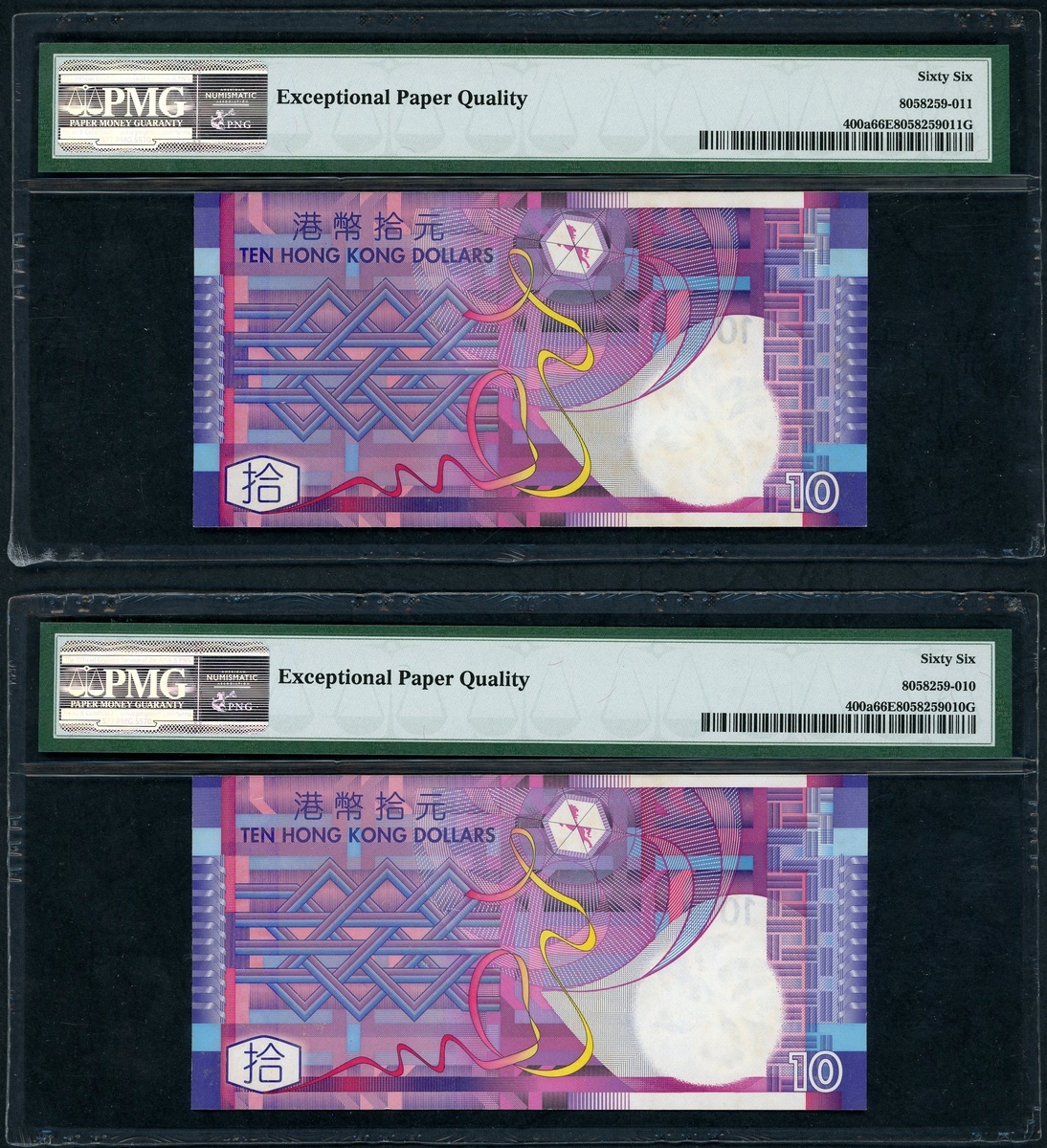 2022年香港政府10元一組9枚,幸運號HP100000,DJ200000,HC300000,MJ400000,HC500000,HC600000,FB700000,FB800000及HA900000,7枚PMG均評66EPQ,其他65EPQ
