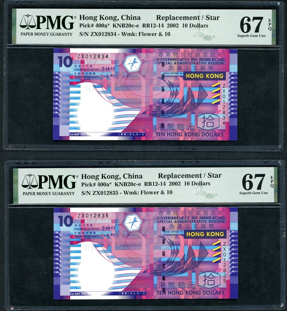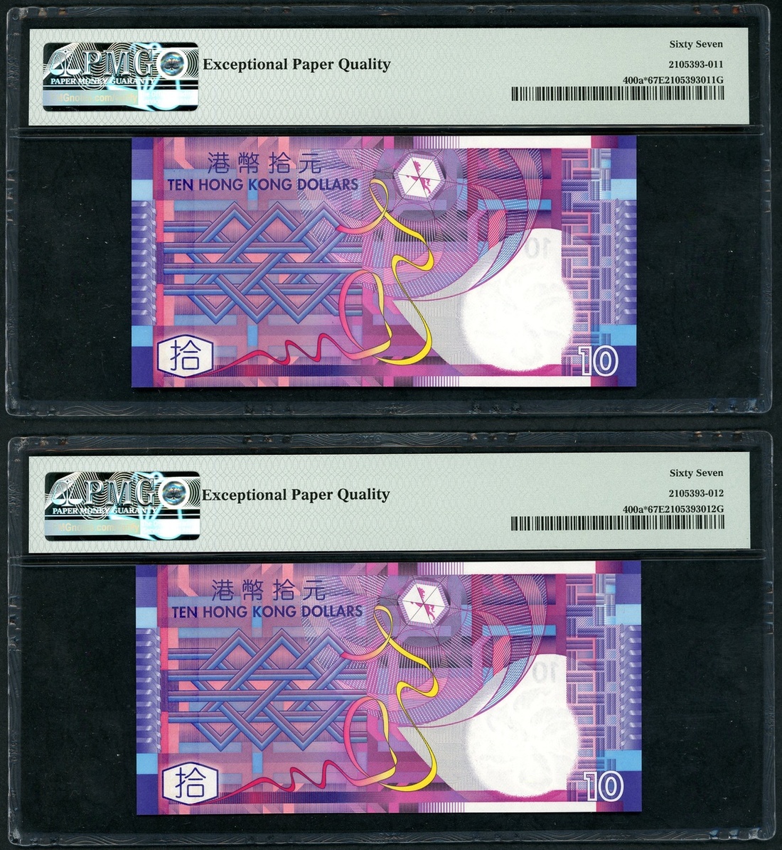 Hong Kong Government, a pair of $10, 1.7.2002, consecutive serial numbers ZX012834-835, (Pick 400a*), both graded PMG 67EPQ, Superb Gem Uncirculated (2)