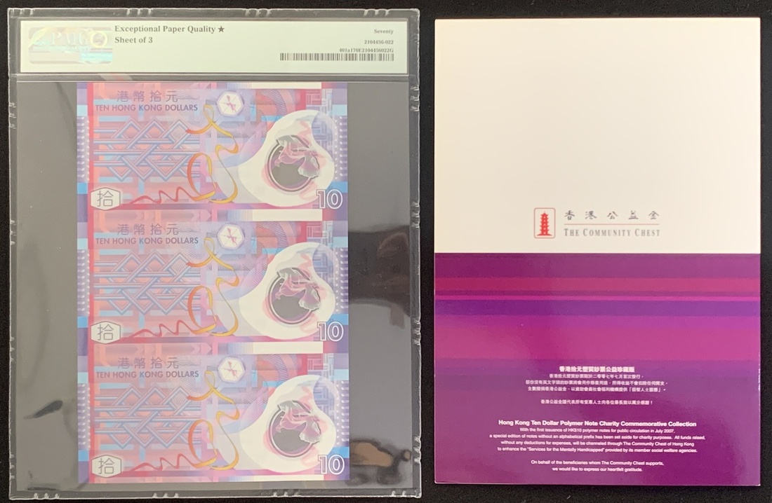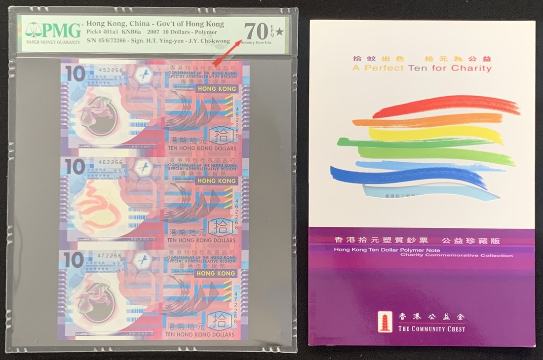 2007年香港政府10元3連體鈔,編號452266/462266/472266,PMG 70EPQ*,連原裝封套