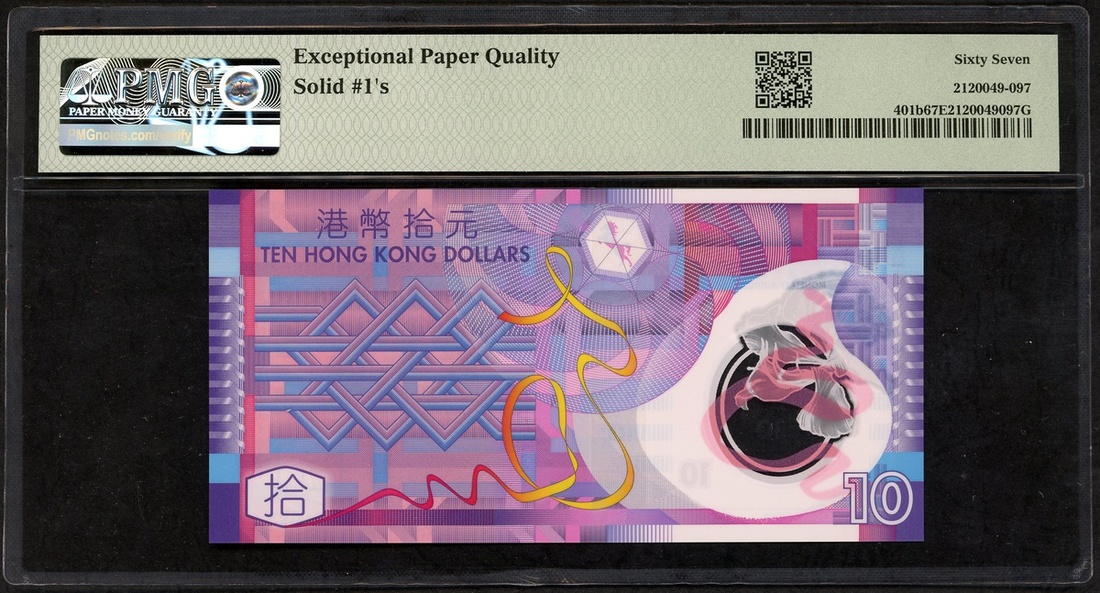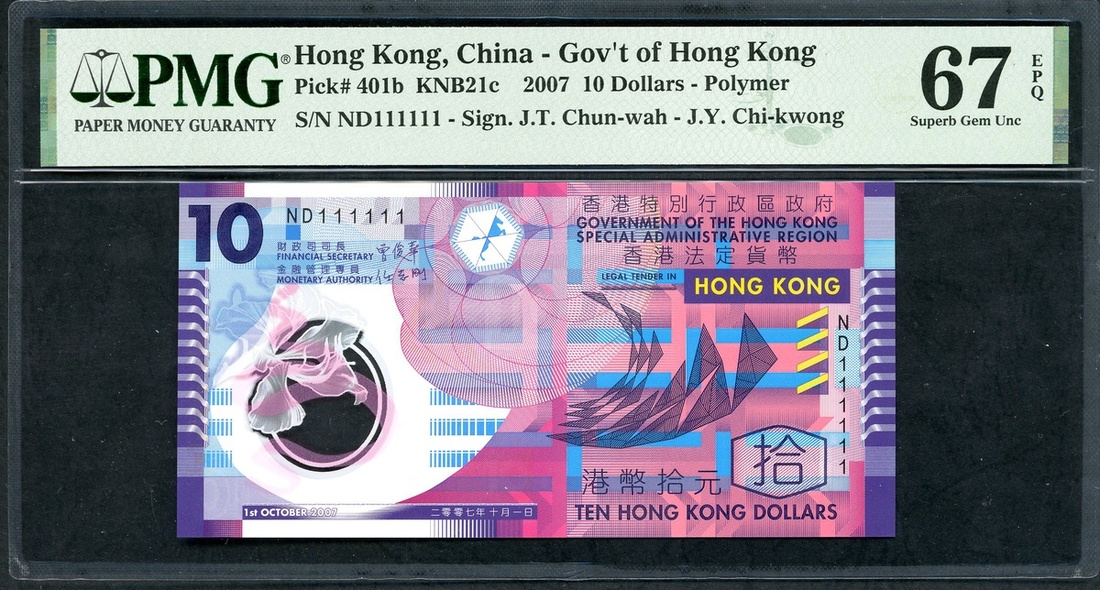 Government of Hong Kong, $10, 1.10.2007, solid serial number ND111111, (Pick 401b), PMG 67EPQ Superb Gem Uncirculated.