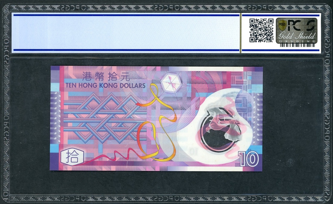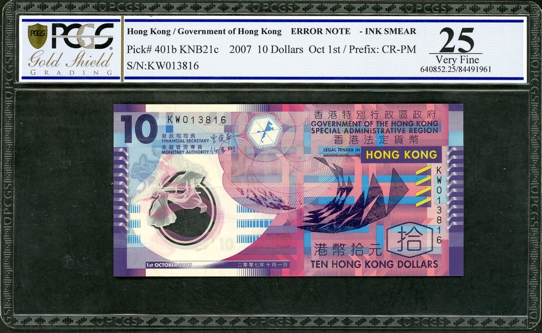 Government of Hong Kong, ERROR polymer $10 1.10.2007, serial number KW013816, ink smear on obverse centre, (Pick 401b) PCGS Gold Shield 25 Very Fine. Polymer error scarce