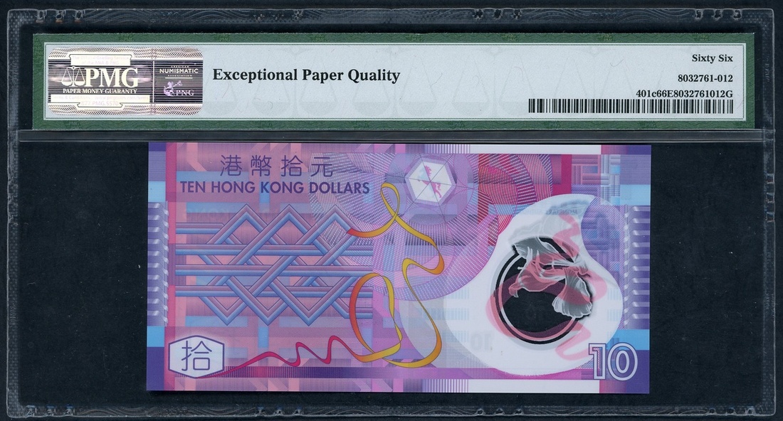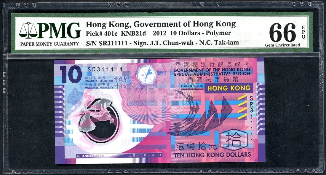 Government of Hong Kong, $10, 1.1.2012, serial number SR311111, (Pick 401c), PMG 66EPQ Gem Uncirculated.