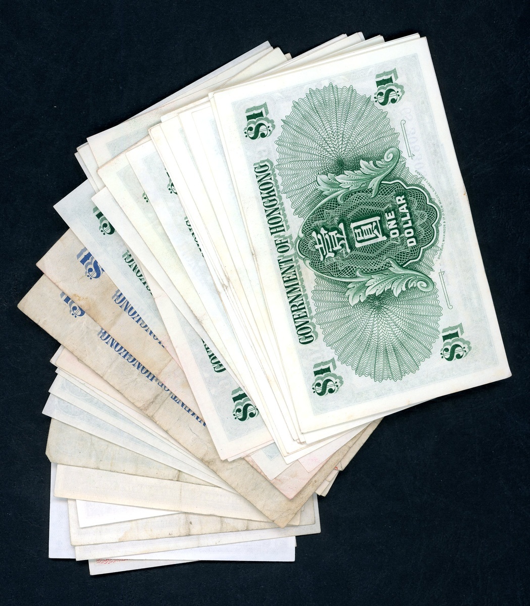 香港政府紙鈔一組46枚,包括1936年1元兩枚;1941年1仙;1949至1952年1元六枚(當中有四枚連號);1952,1958,1959年1仙六枚,5仙五枚,1毫八枚及1元十八枚(當中有十枚連號),VF或以上品相