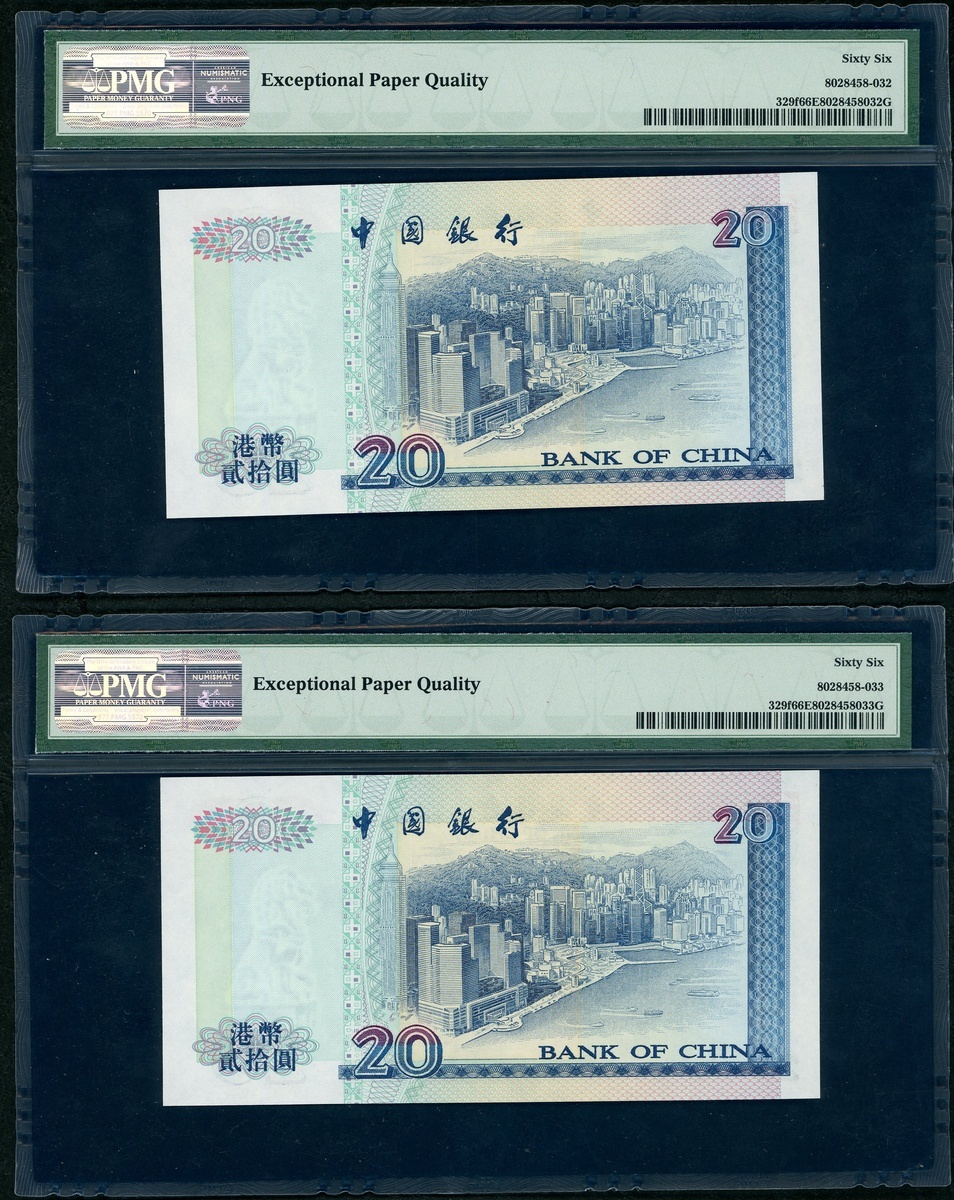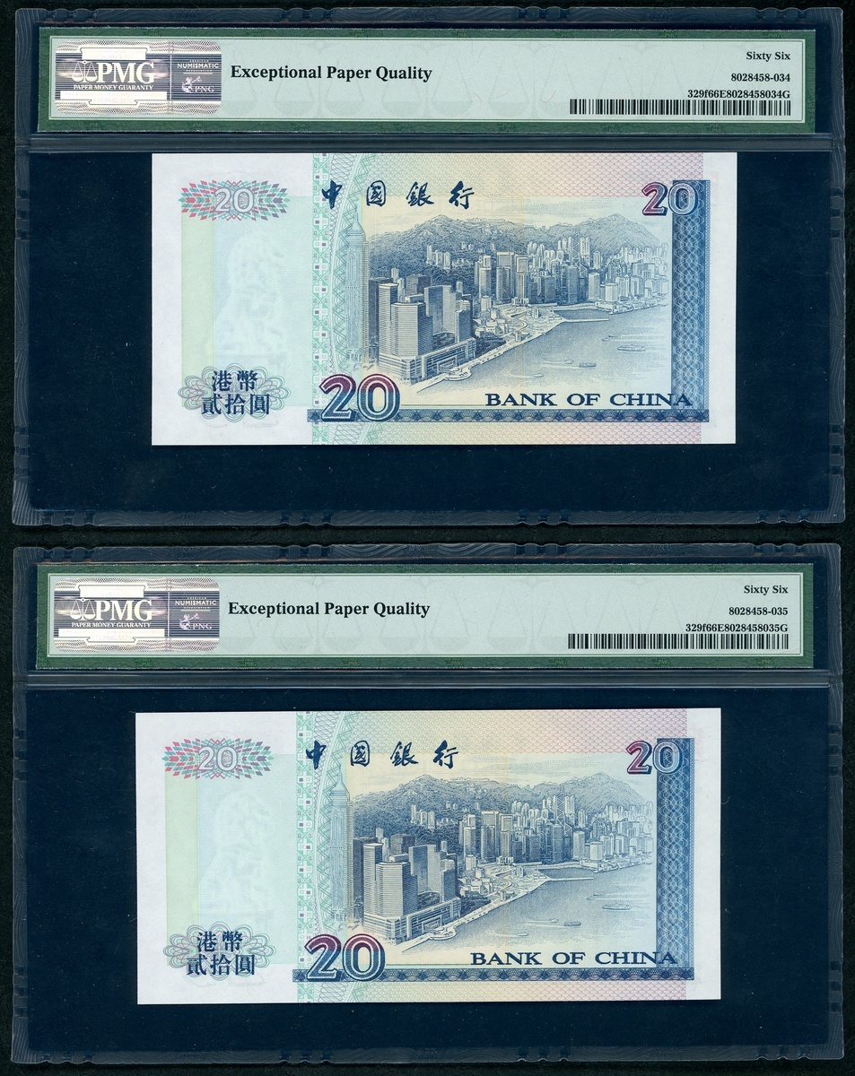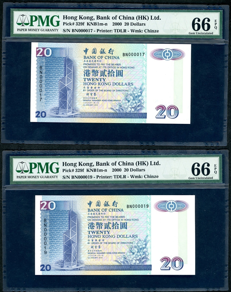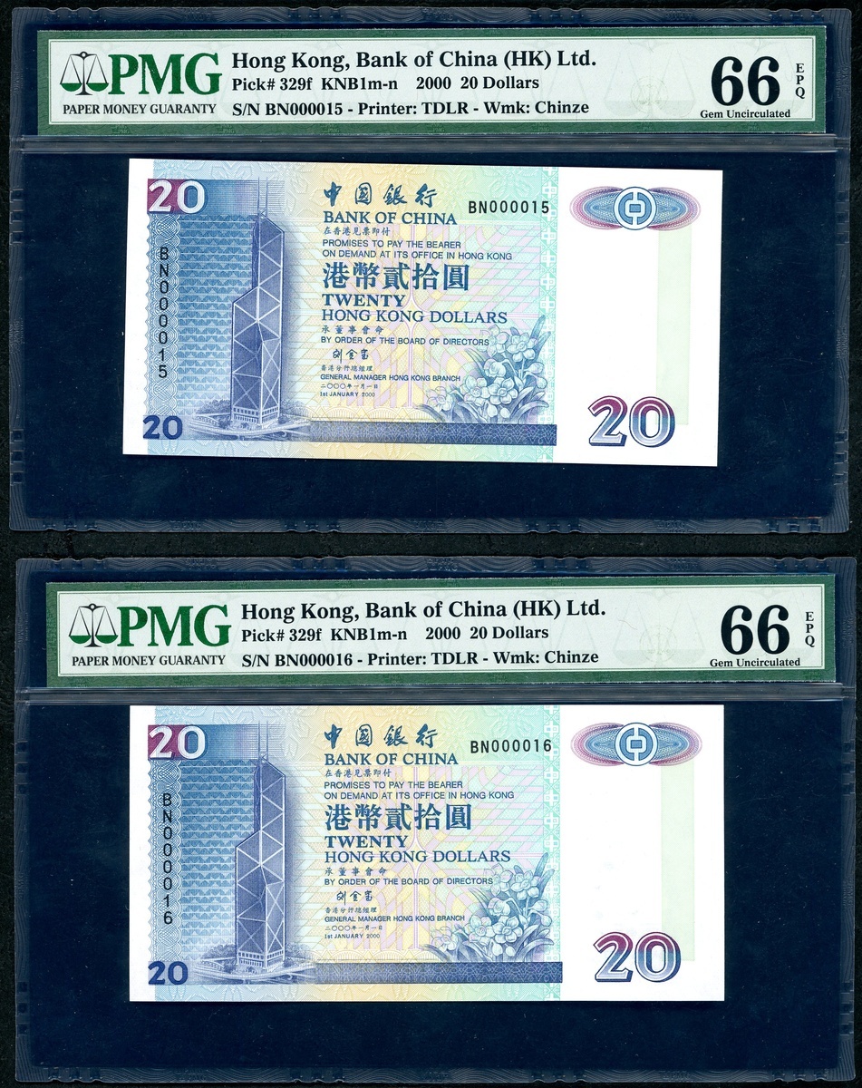 Bank of China, Hong Kong, a group of 4x low number $20, 1.1.2000, serial numbers BN000015-17, 000019, (Pick 329f), PMG 66EPQ Superb Gem Uncirculated (4)