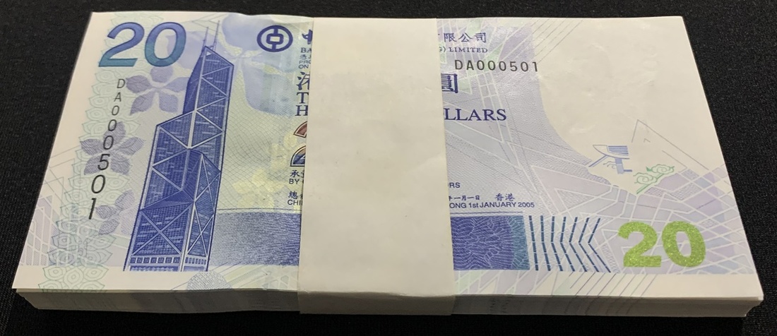 Bank of China, Hong Kong, a consecutive run of 100x $20, 1.1.2005, serial numbers DA000501-600, including fancy number DA000555, (Pick 335c), uncirculated (100).
