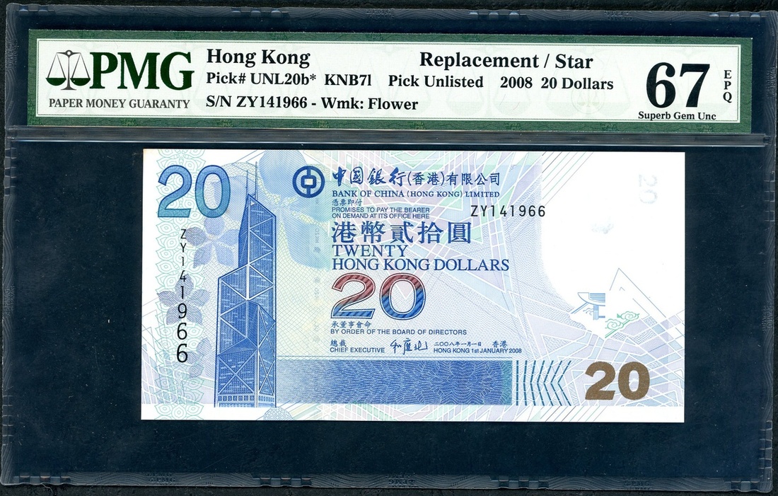 Bank of China, Hong Kong, $20, 1.1.2008, replacement serial number ZY141966, (Pick 335e*), PMG 67EPQ Superb Gem Uncirculated