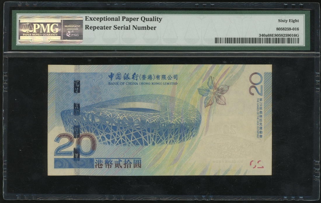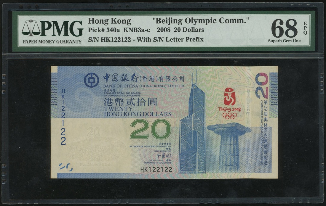 Bank of China (Hong Kong) Limited, $20, 2008 Beijing Olympics commemorative, 1.1.2008, repeater serial number HK122122, (Pick 340a), PMG 68EPQ Superb Gem Uncirculated.