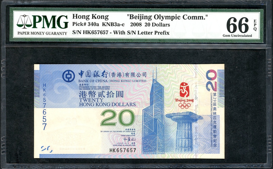 Bank of China, Hong Kong, $20, 1.1.2008, Beijing 2008 Olympics commemorative issue, repeater serial number HK657657, (Pick 340a), PMG 66EPQ Gem Uncirculated.