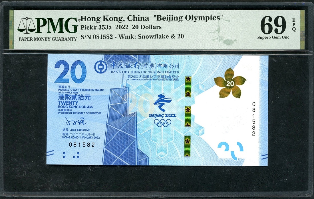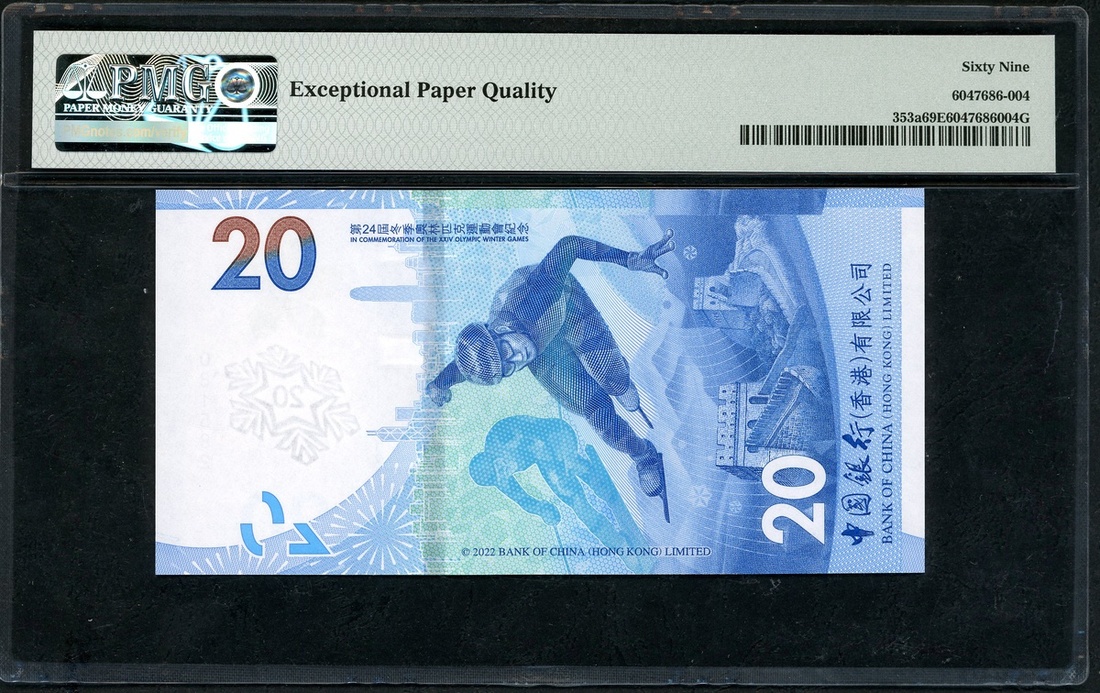 Bank of China, Hong Kong, $20, 1.1.2022, Commemorative issue of China Beijing Olympics, serial number 081582, (Pick 353a), PMG 69EPQ, super high grade.