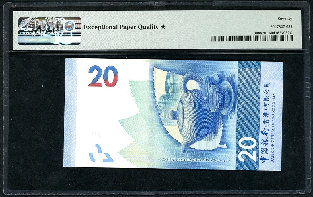 Bank of China (Hong Kong) Limited, $20, 1.1.2018, near-solid serial number AB888880, (Pick 348a), PMG 70EPQ* Seventy Gem Uncirculated.