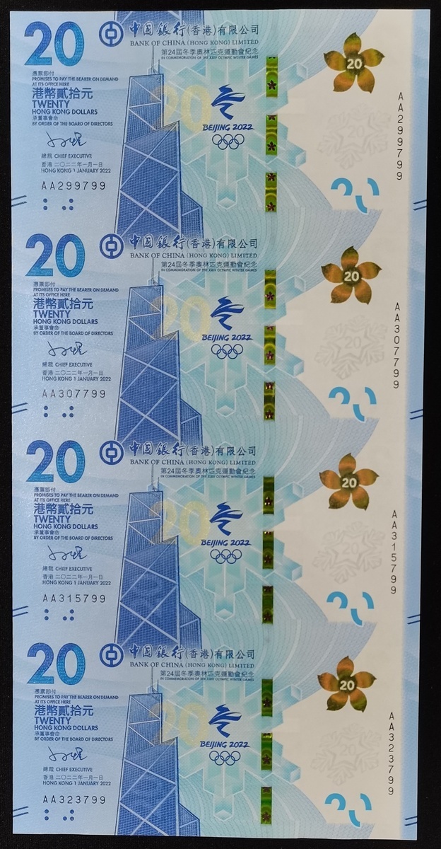 Bank of China (Hong Kong) Limited, a uncut sheet of 4x $20, 1.1.2022, in commemoration of the XXIV Olympic Winter Games, serial numbers AA299799, AA307799, AA315799 and AA323799, (Pick W353), uncirculated, with original folder (uncut sheet of 4 note).