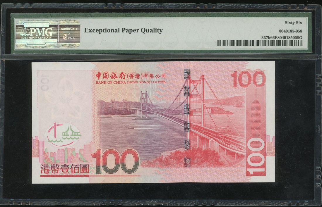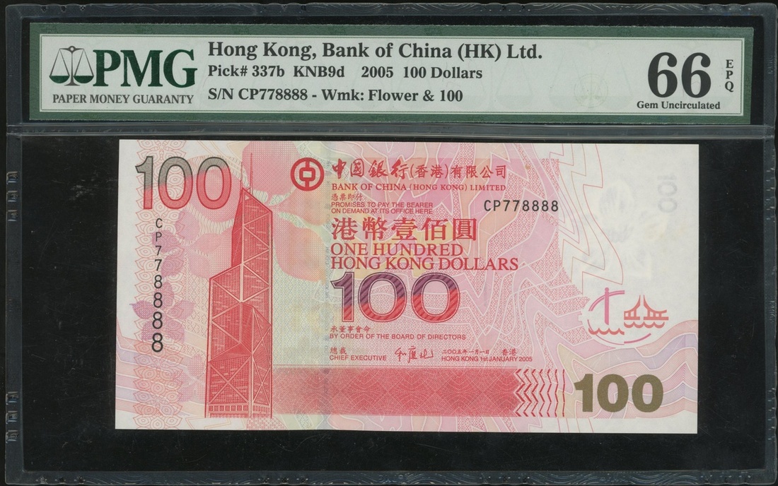 Bank of China (Hong Kong) Limited, $100, 1.1.2005, fancy serial number CP778888, (Pick 337b), PMG 66EPQ Gem Uncirculated.
