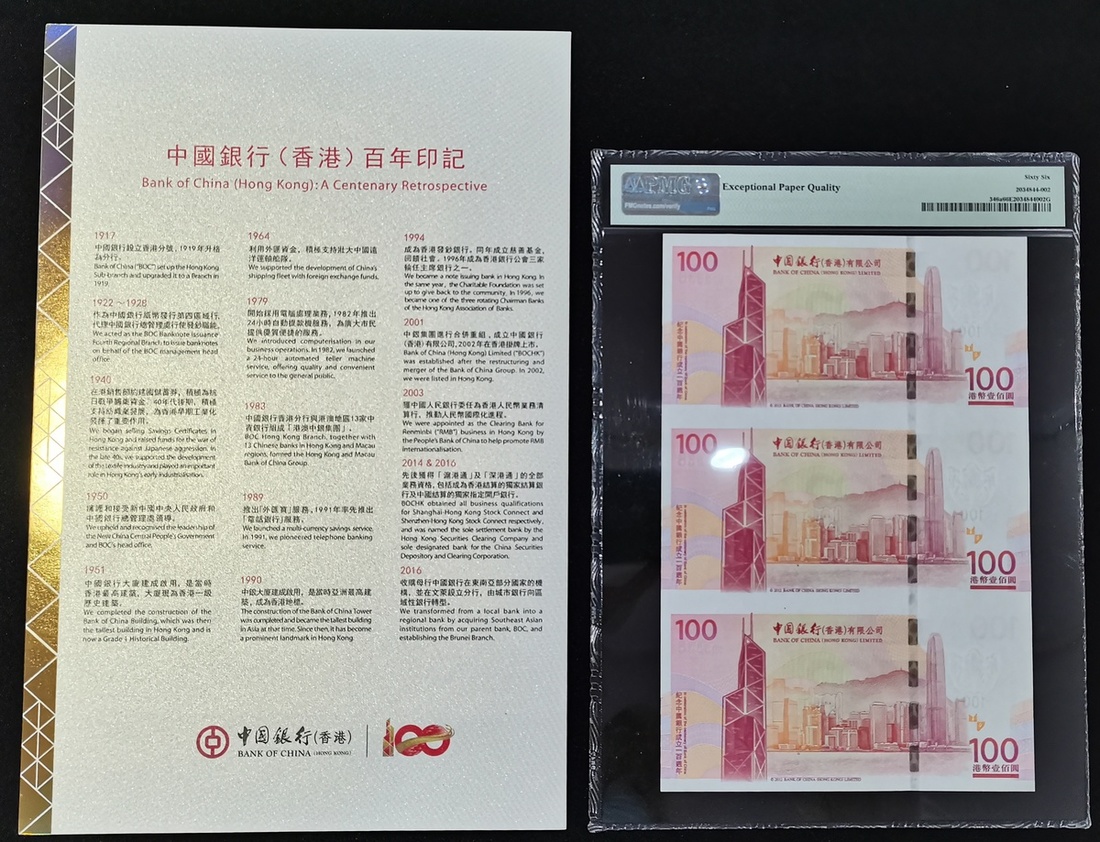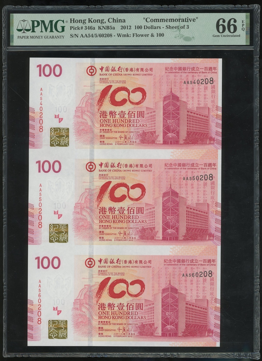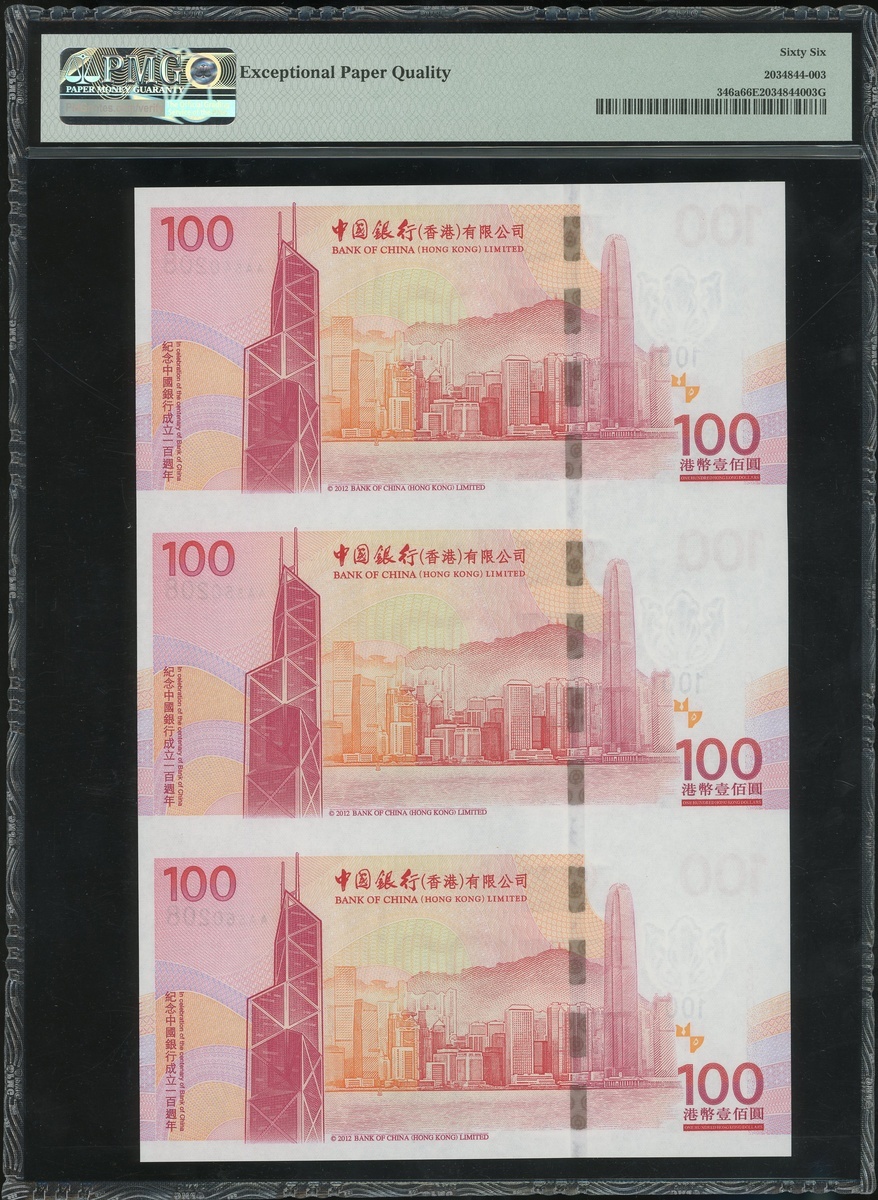 2012年中國銀行100元3連體一組3枚,編號以3616, 3838 及 0208作結,均PMG 66EPQ,連原封套