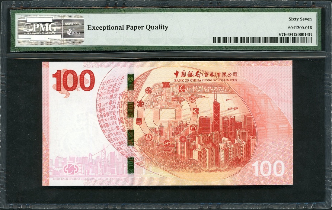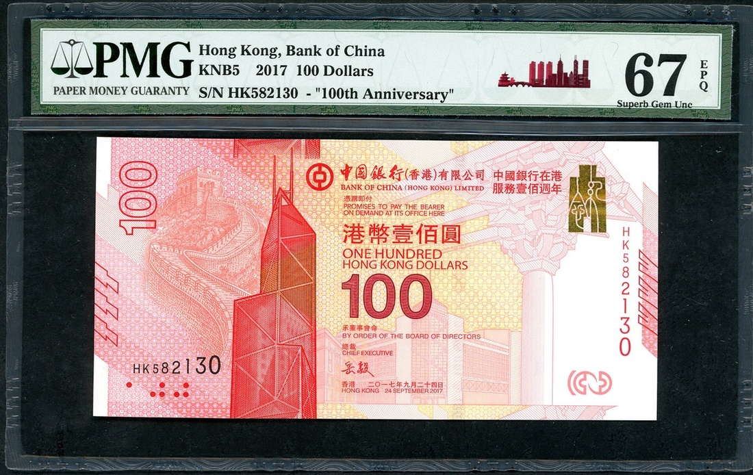 Bank of China, Hong Kong, commemorative $100, 2017, '100th anniversary', serial number HK582130, (Pick 347), PMG 67EPQ Superb Gem Unc