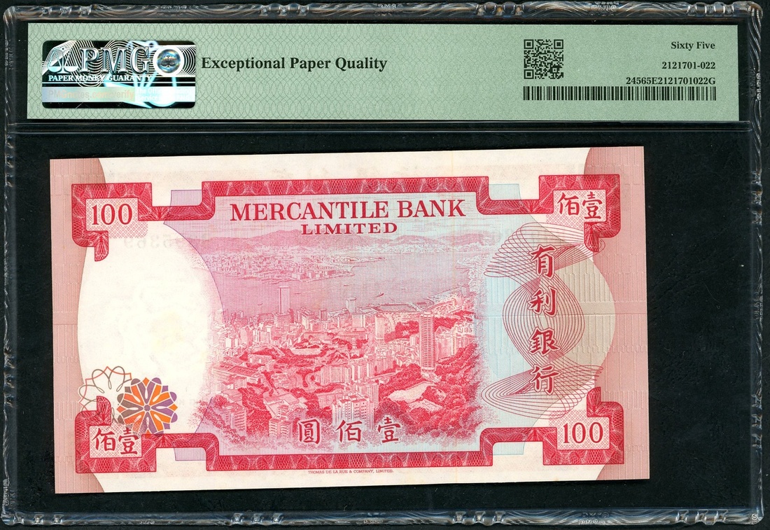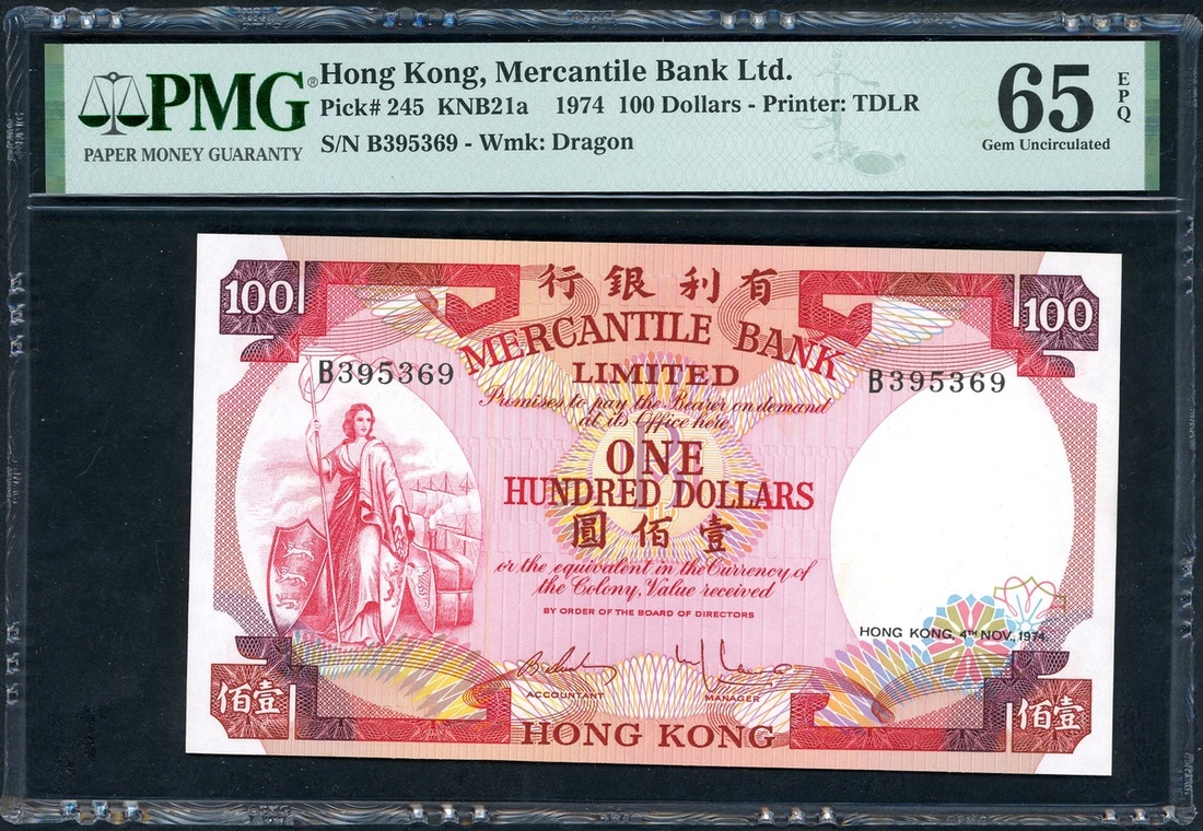 Mercantile Bank Limited, Hong Kong, $100, 4 November 1974, serial number B395369, (Pick 245), PMG 65EPQ Gem Uncirculated