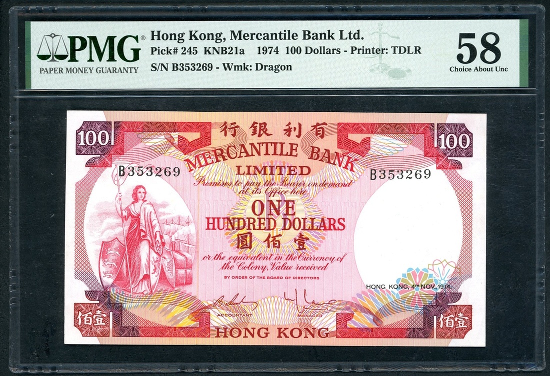 Mercantile Bank Limited, Hong Kong, $100, 4.11.1974, serial number B353269, (Pick 245), PMG 58 Choice About Uncirculated