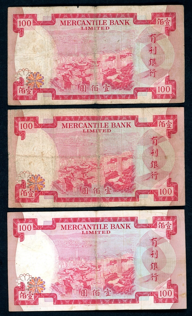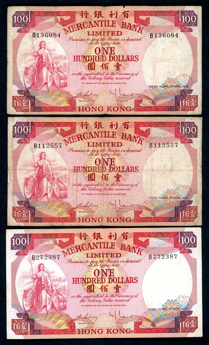 Mercantile Bank, Hong Kong, a group of 3x $100, 4.11.1974, serial numbers B272387, B136084 and B112557, (Pick 245), the first note very fine and the rest about fine (3).
