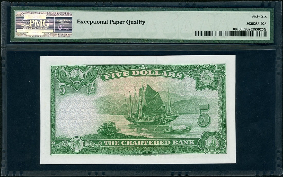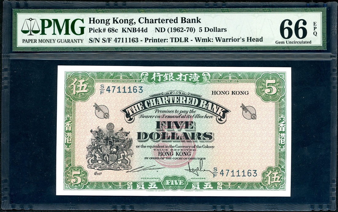 The Chartered Bank, Hong Kong, $5, ND(1962-70), serial number S/F 4711163, (Pick 68c), PMG 66EPQ Gem Uncirculated.