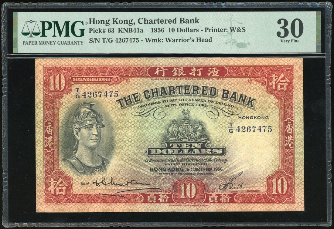 The Chartered Bank, Hong Kong, $10, 6.12.1956, serial number T/G 4267475, (Pick 63), PMG 30 Very Fine.