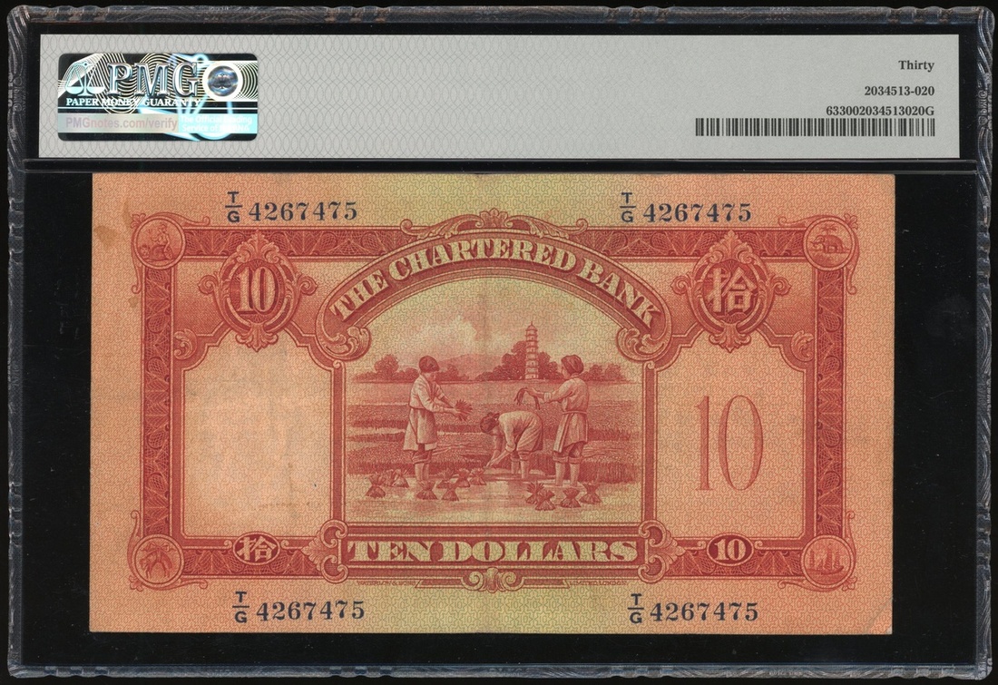 1956年渣打銀行10元,編號T/G 4267475,PMG 30