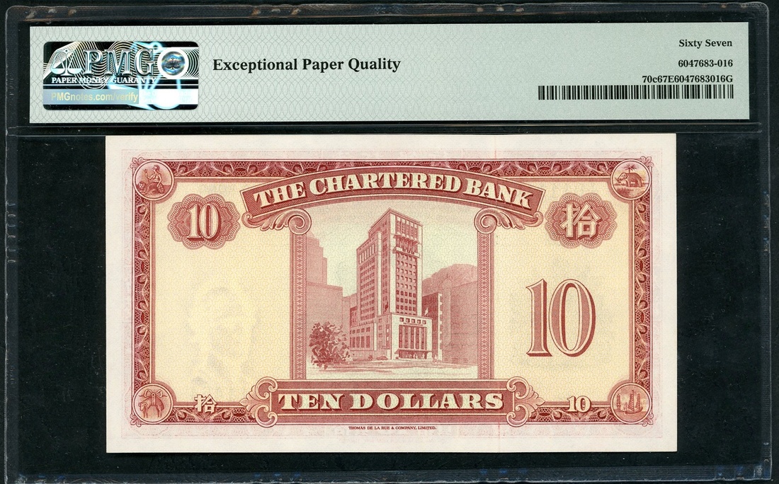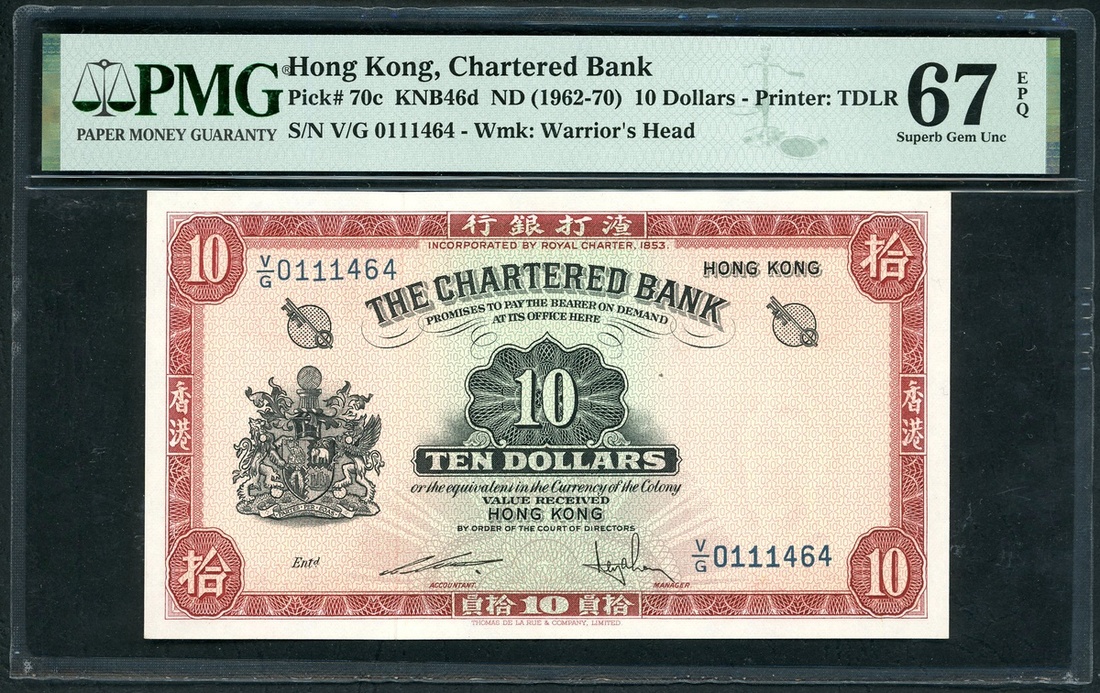 1962至1970年渣打銀行10元,編號V/G 0111464,PMG 67EPQ