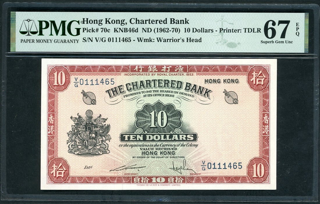 1962至1970年渣打銀行10元,編號V/G 0111465,PMG 67EPQ