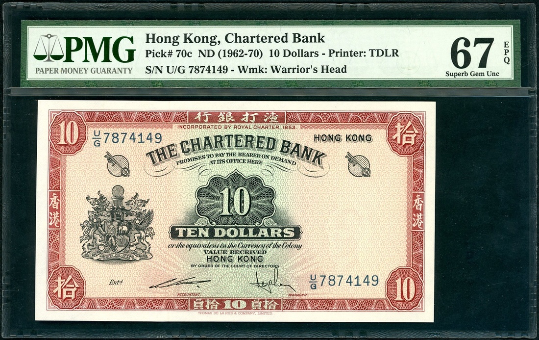 The Chartered Bank, Hong Kong, $10, ND (1962-1970), serial number U/G 7874149, (Pick 70c), PMG 67EPQ Superb Gem Uncirculated